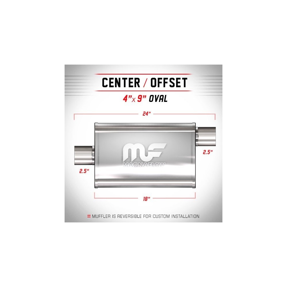 I Silenziatori MagnaFlow Performance sono in acciaio inox 100% e saldati con giunture a giro per una solida e robusta affidabilita' anche nelle condizioni piu' estreme. Sono caratterizzati da un flusso libero, che scorre dritto attraverso un nucleo perforato in acciaio inossidabile, avvolti in rete metallica e riempiti con fibra acustica per ottenere quel liscio, profondo tono. I Silenziatori sono incapsulati con materiale fonoassorbente per garantirne una lunga durata senza degradazione del suono. INFO TECNICHE: Silenziatore ovale 4''x9'' (10.16x22.86cm) - Lunghezza totale: 24'' (60.96cm) - Lunghezza silenziatore: 18'' (45.72cm) - Uscite: 2.5'' e 2.5'' (6.35 e 6.35cm) - Posizione: Center/Offset