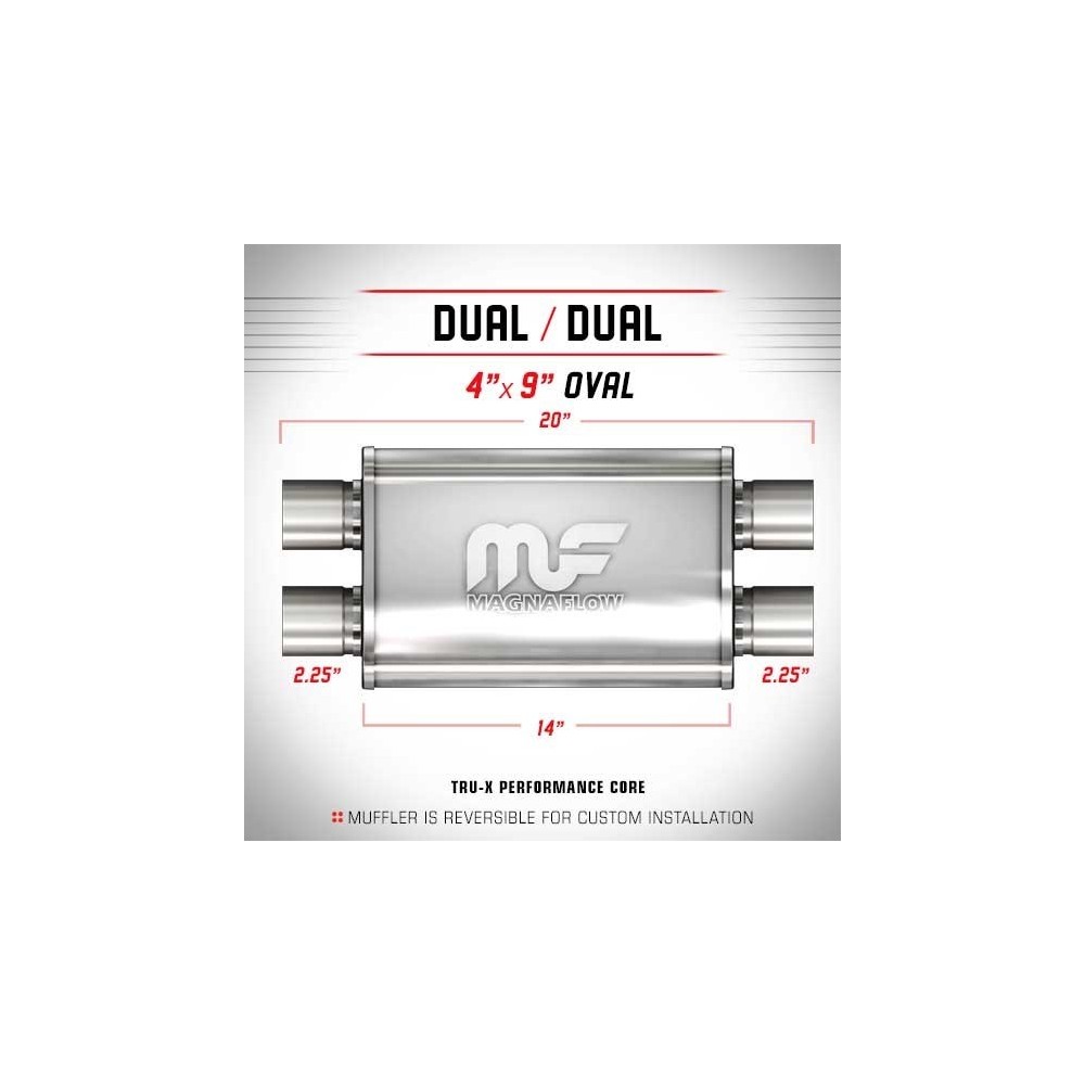 I Silenziatori MagnaFlow Performance sono in acciaio inox 100% e saldati con giunture a giro per una solida e robusta affidabilita' anche nelle condizioni piu' estreme. Sono caratterizzati da un flusso libero, che scorre dritto attraverso un nucleo perforato in acciaio inossidabile, avvolti in rete metallica e riempiti con fibra acustica per ottenere quel liscio, profondo tono. I Silenziatori sono incapsulati con materiale fonoassorbente per garantirne una lunga durata senza degradazione del suono. INFO TECNICHE: Silenziatore ovale 4''x9'' (10.16x22.86cm) - Lunghezza totale: 20'' (50.8cm) - Lunghezza silenziatore: 14'' (35.56cm) - Uscite: 2.25'' e 2.25'' (5.71 e 5.71cm) - Posizione: Dual/Dual