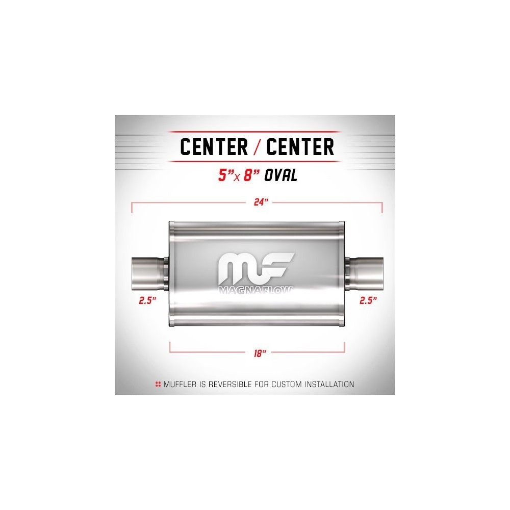 I Silenziatori MagnaFlow Performance sono in acciaio inox 100% e saldati con giunture a giro per una solida e robusta affidabilita' anche nelle condizioni piu' estreme. Sono caratterizzati da un flusso libero, che scorre dritto attraverso un nucleo perforato in acciaio inossidabile, avvolti in rete metallica e riempiti con fibra acustica per ottenere quel liscio, profondo tono. I Silenziatori sono incapsulati con materiale fonoassorbente per garantirne una lunga durata senza degradazione del suono. INFO TECNICHE: Silenziatore ovale 5''x8'' (12.7x20.32cm) - Lunghezza totale: 24'' (60.96cm) - Lunghezza silenziatore: 18'' (45.72cm) - Uscite: 2.5'' e 2.5'' (6.35 e 6.35cm) - Posizione: Center/Center