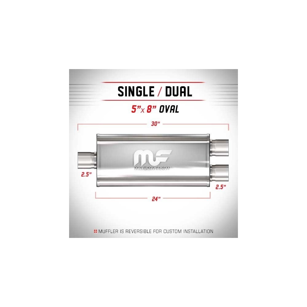 I Silenziatori MagnaFlow Performance sono in acciaio inox 100% e saldati con giunture a giro per una solida e robusta affidabilita' anche nelle condizioni piu' estreme. Sono caratterizzati da un flusso libero, che scorre dritto attraverso un nucleo perforato in acciaio inossidabile, avvolti in rete metallica e riempiti con fibra acustica per ottenere quel liscio, profondo tono. I Silenziatori sono incapsulati con materiale fonoassorbente per garantirne una lunga durata senza degradazione del suono. INFO TECNICHE: Silenziatore ovale 5''x8'' (12.7x20.32cm) - Lunghezza totale: 30'' (76.2cm) - Lunghezza silenziatore: 24'' (60.96cm) - Uscite: 2.5'' e 2.5'' (6.35 e 6.35cm) (x2) - Posizione: Single/Dual