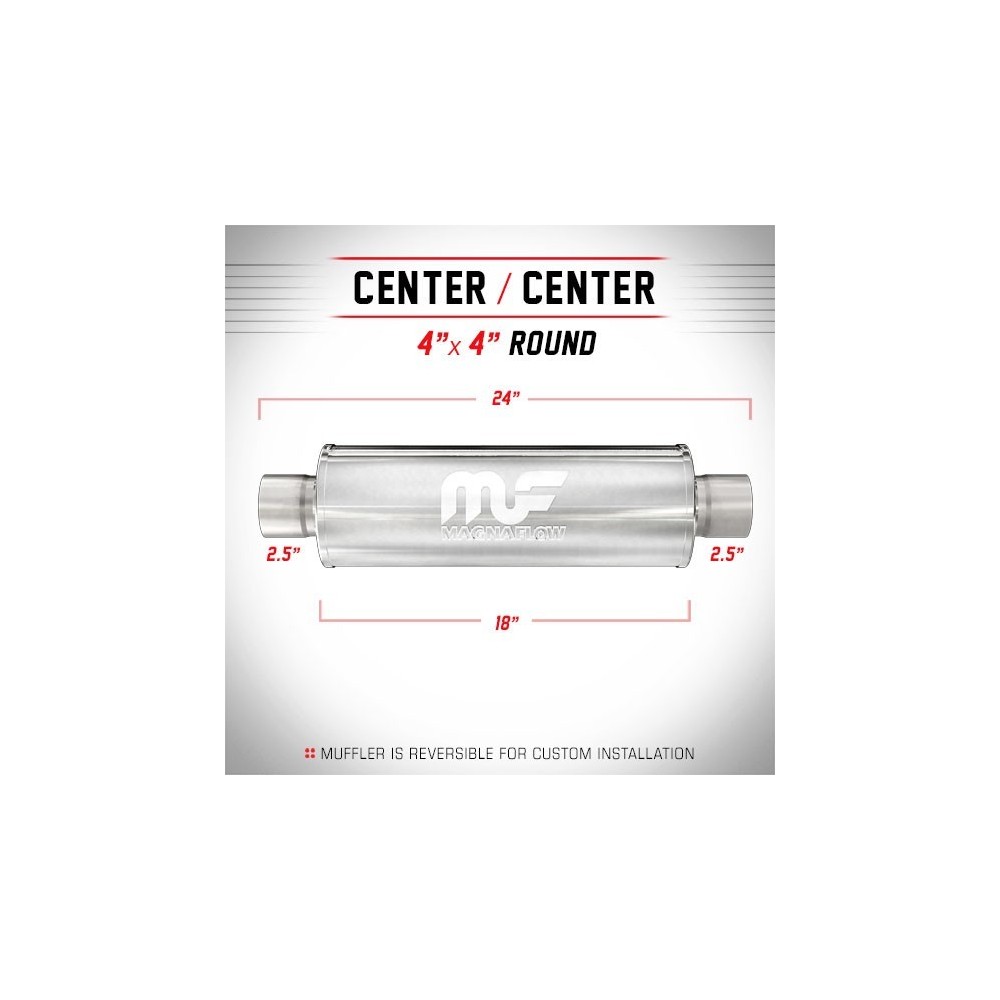 I Silenziatori MagnaFlow Performance sono in acciaio inox 100% e saldati con giunture a giro per una solida e robusta affidabilita' anche nelle condizioni piu' estreme. Sono caratterizzati da un flusso libero, che scorre dritto attraverso un nucleo perforato in acciaio inossidabile, avvolti in rete metallica e riempiti con fibra acustica per ottenere quel liscio, profondo tono. I Silenziatori sono incapsulati con materiale fonoassorbente per garantirne una lunga durata senza degradazione del suono. INFO TECNICHE: Silenziatore tondo 4'' (10.16cm) - Lunghezza totale: 24'' (60.96cm) - Lunghezza silenziatore: 18'' (45.72cm) - Uscite: 2.5'' e 2.5'' (6.35 e 6.35cm) - Posizione: Center/Center