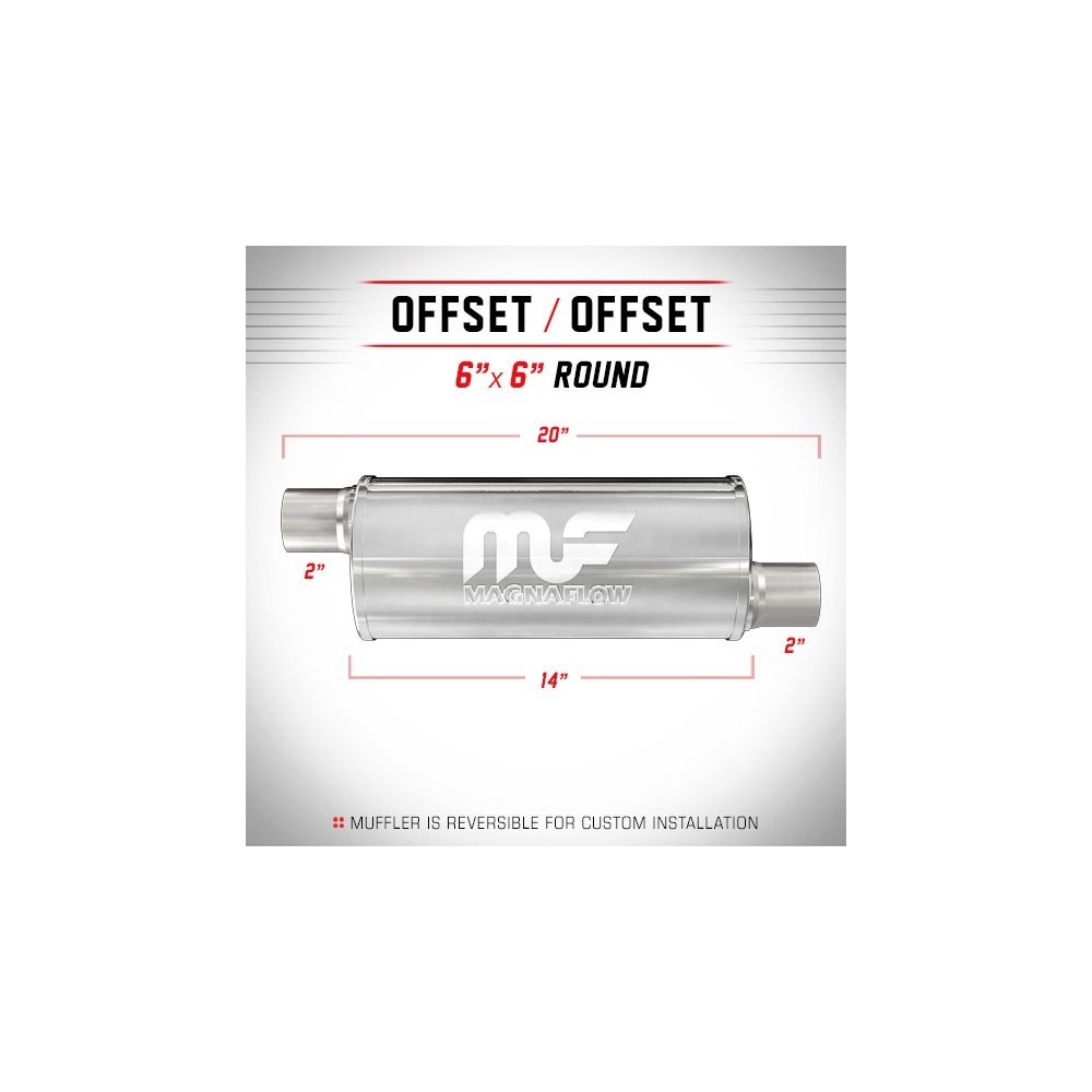 I Silenziatori MagnaFlow Performance sono in acciaio inox 100% e saldati con giunture a giro per una solida e robusta affidabilita' anche nelle condizioni piu' estreme. Sono caratterizzati da un flusso libero, che scorre dritto attraverso un nucleo perforato in acciaio inossidabile, avvolti in rete metallica e riempiti con fibra acustica per ottenere quel liscio, profondo tono. I Silenziatori sono incapsulati con materiale fonoassorbente per garantirne una lunga durata senza degradazione del suono. INFO TECNICHE: Silenziatore tondo 6'' (15.24cm) - Lunghezza totale: 20'' (50.8cm) - Lunghezza silenziatore: 14'' (35.56cm) - Uscite: 2'' e 2'' (5.08 e 5.08cm) - Posizione: Offset/Offset