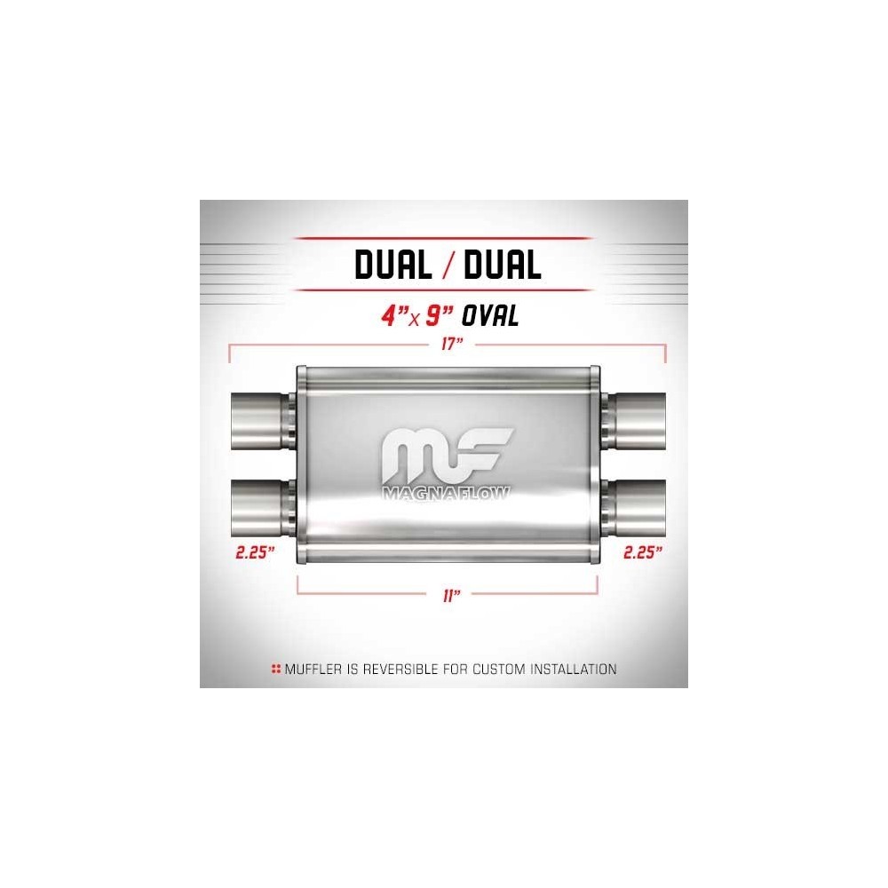 I Silenziatori MagnaFlow Performance sono in acciaio inox 100% e saldati con giunture a giro per una solida e robusta affidabilita' anche nelle condizioni piu' estreme. Sono caratterizzati da un flusso libero, che scorre dritto attraverso un nucleo perforato in acciaio inossidabile, avvolti in rete metallica e riempiti con fibra acustica per ottenere quel liscio, profondo tono. I Silenziatori sono incapsulati con materiale fonoassorbente per garantirne una lunga durata senza degradazione del suono. INFO TECNICHE: Silenziatore ovale 4''x9'' (10.16x22.86cm) - Lunghezza totale: 17'' (43.18cm) - Lunghezza silenziatore: 11'' (27.94cm) - Uscite: 2.25'' e 2.25'' (5.7 e 5.7cm) - Posizione: Dual x 2