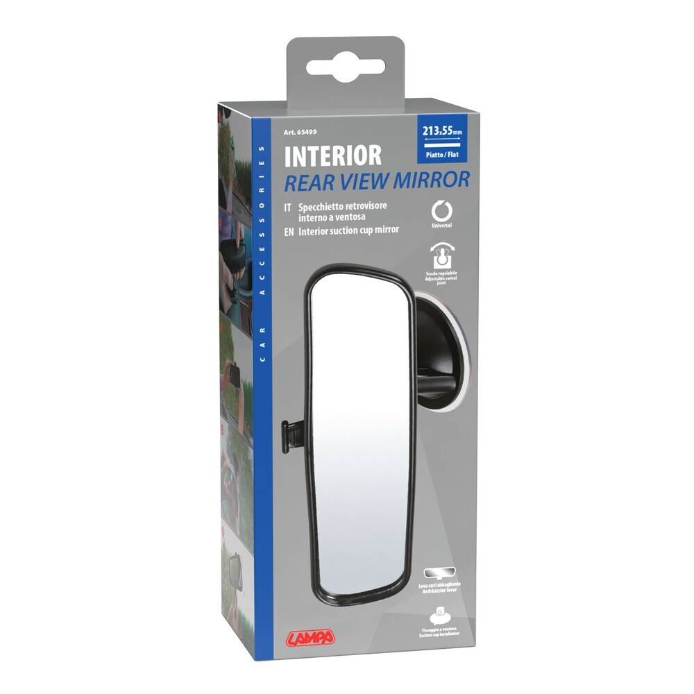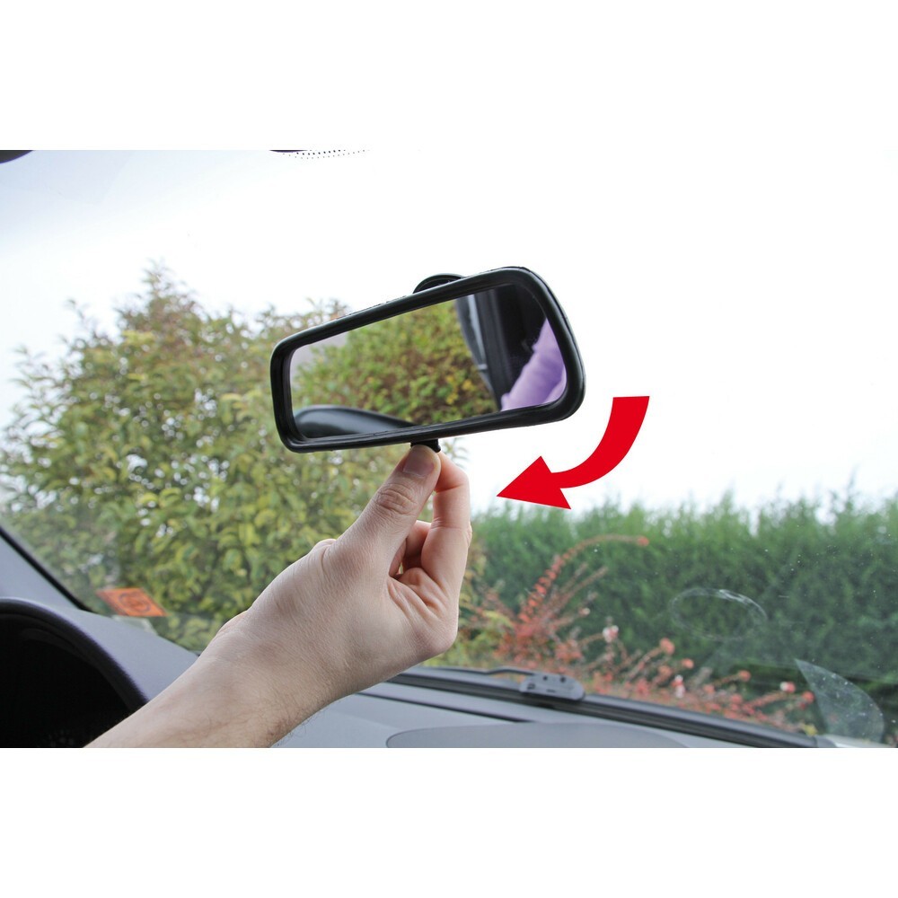 Specchietto retrovisore interno per auto. Fissaggio a ventosa. Lo snodo a sfera permette una regolazione ottimale. CON ANTIABBAGLIANTE. Misure: 200x65mm
