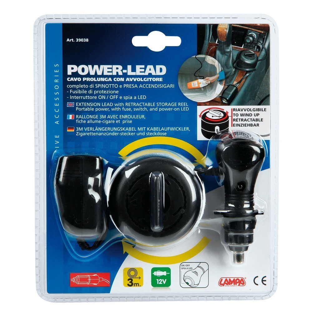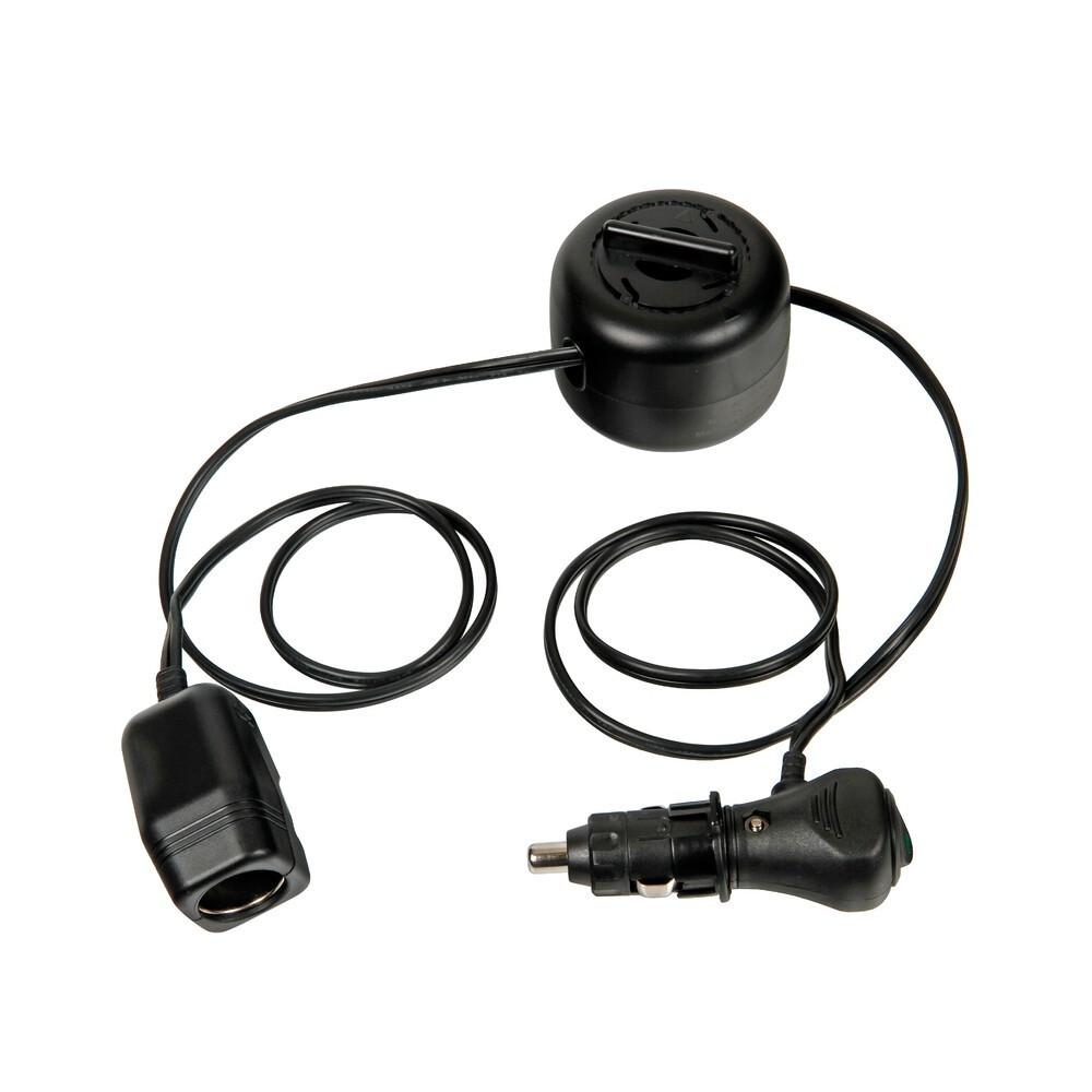 Presa accendisigari con prolunga avvolgitore 12V, spinotto con fusibile di protezione, interruttore on/off con spia a led, cavo con lunghezza max 3 metri