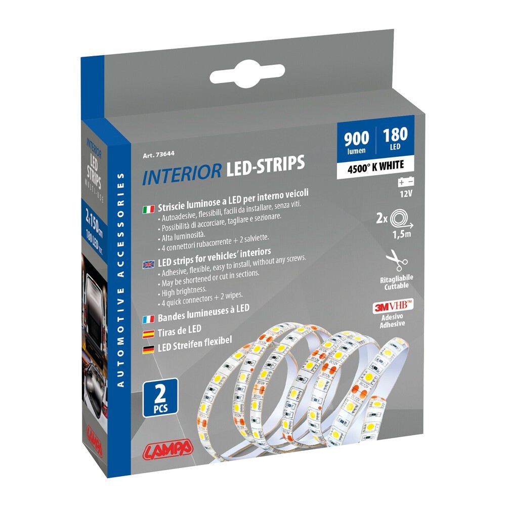 Set 2 striscie a Led autoadesive per interno, flessibili, facili da installare, senza viti. Possibilita' di accorciare, tagliare e sezionare ogni 5 cm (3 Led). Ogni sezione da 3 Led puo' essere a sua volta utilizzata collegando l'alimentazione 12V ai contatti sul circuito stampato. Alta luminosita' (900 lm - 4500K) Il kit comprende: 2 striscie da 150 cm (90 Smd) cadauna, 4 connettori rubacorrente, 2 salviette.
