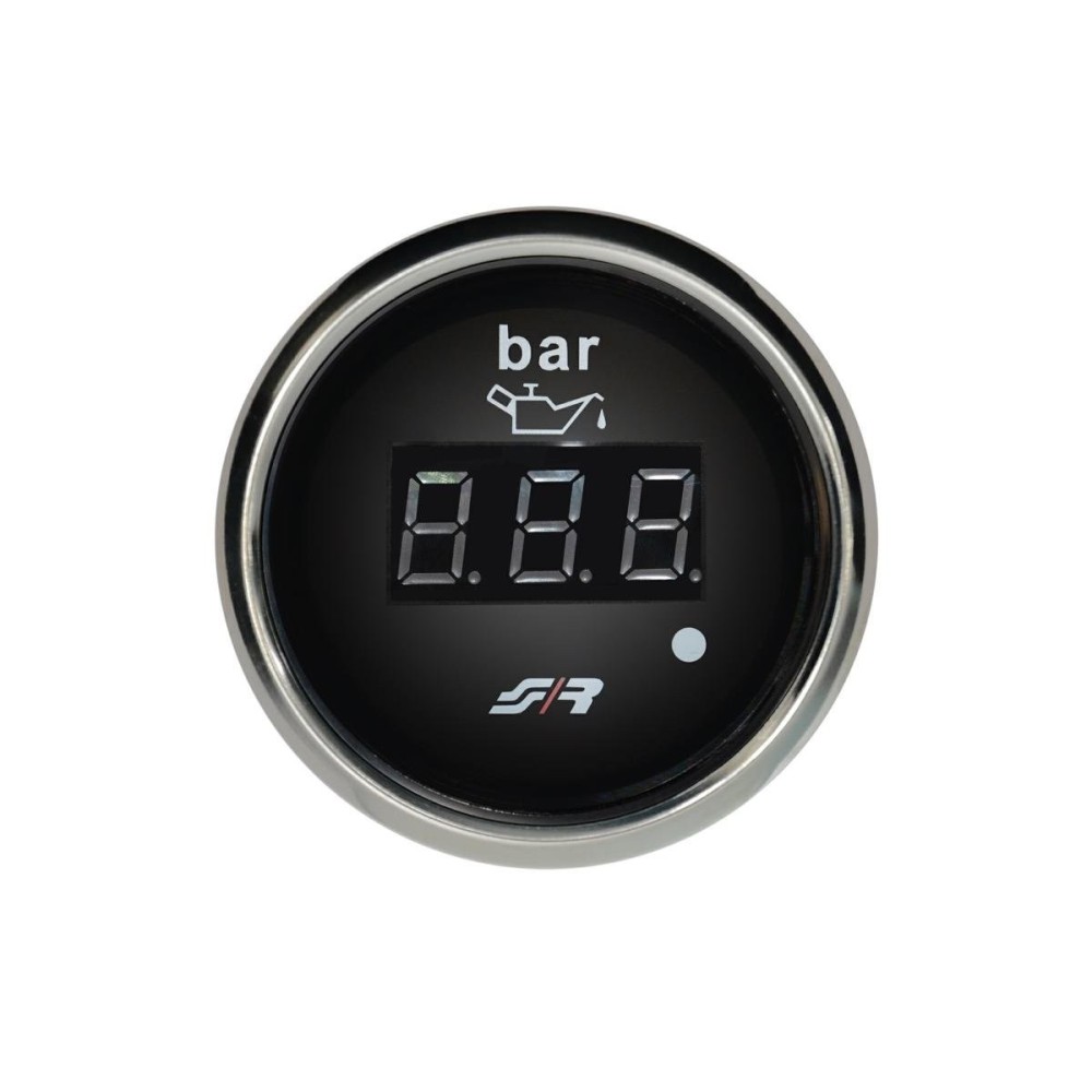 Strumenti da 2'' linea digitale. Indicatore digitale pressione olio con sensore. Fondo nero retroilluminato a led 0-10 BAR e funzione di allerta. Bordo cromato