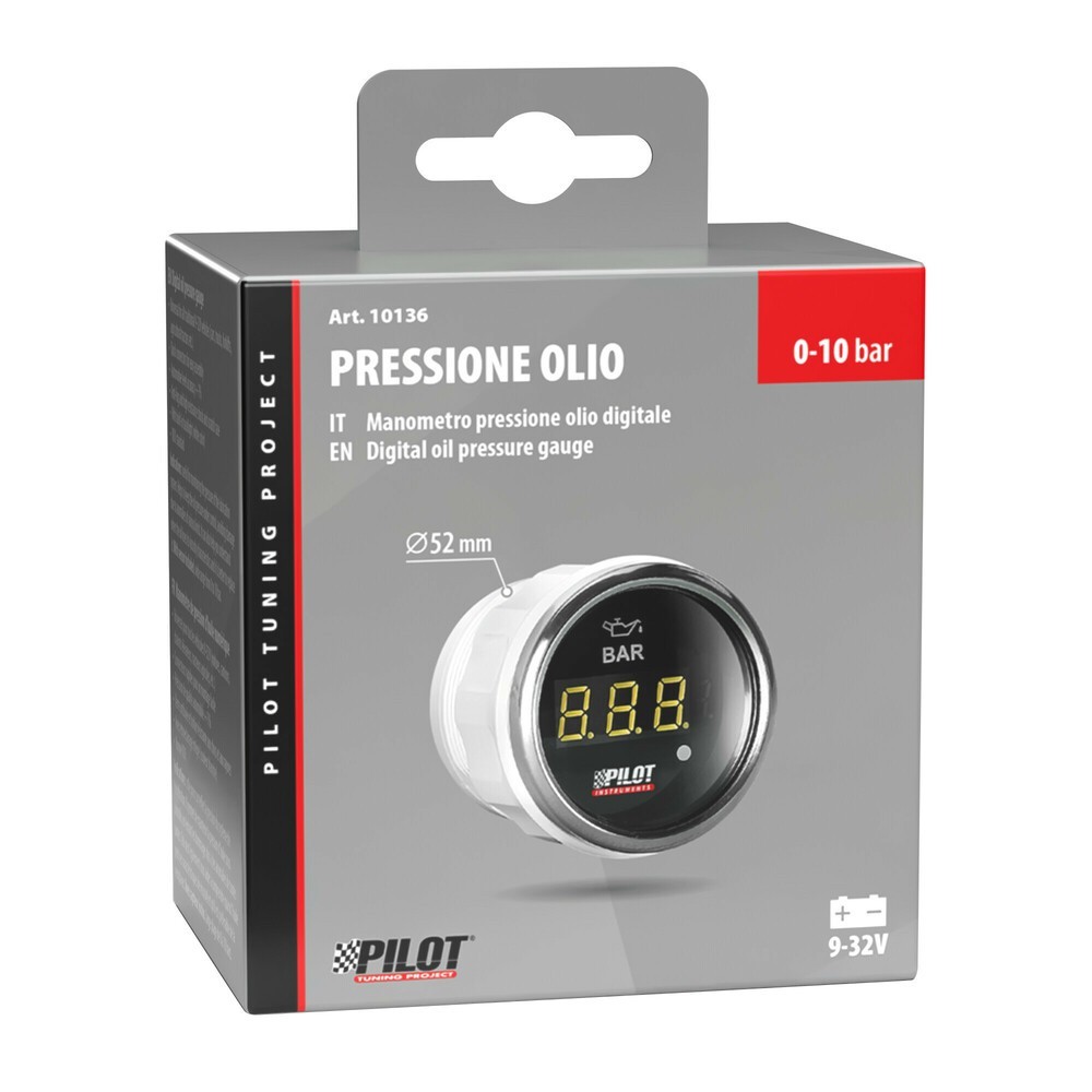 Universale per tutti i veicoli 9-32V (automobili, camion, carrelli elevatori, trattori agricoli ecc.). Precisione di livello automobilistico +-1%, vetro antiappannamento e antigraffio. Retroilluminazione integrata (colore bianco). Norma VDO. Impermeabile IP67. Indicatore da 0 a 10 bar. Sensore incluso. Montaggio tramite connettori rapidi. Diametro 2'' (52 mm)