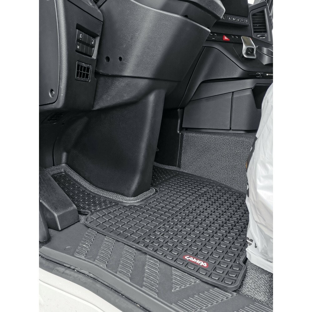 Compatibilita': Mercedes Actros MP4 dal 09/2011 al 09/2019 - Mercedes Antos dal 09/2012 - Mercedes MP5 dal 10/2019>. Coppia tappeti su misura in Eco Gomma per camion, ottima qualita' per una lunga durata. Bordatura a rilievo maggiorato, possono essere utilizzati anche in condizioni estreme con forte presenza di acqua, fango, sporcizia e neve. Retro antiscivolo, facili da pulire, lavabili con idropulitrice.