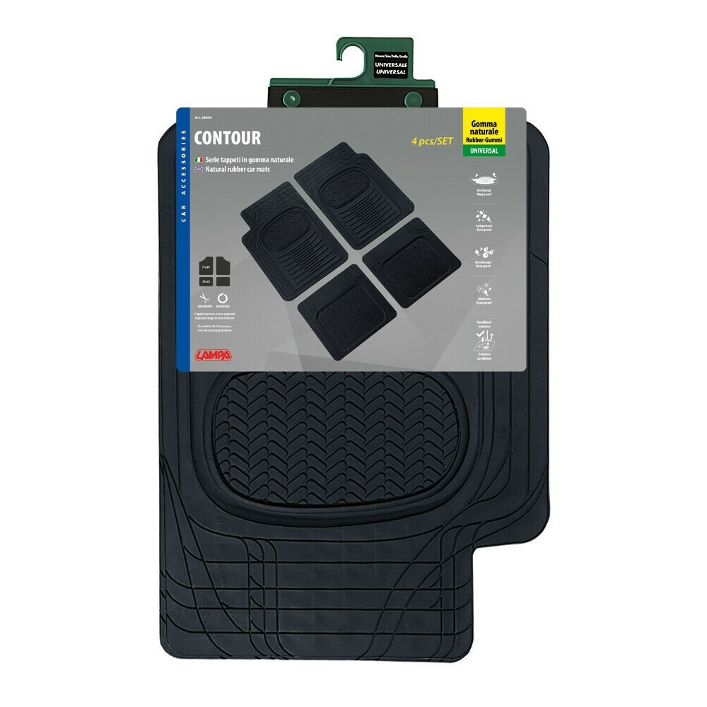 Confezione 4pz. Contour, set 4 pezzi tappeti in gomma. Sagomabili con le forbici. Colore NERO. Dimensioni: anteriore 71x49cm / posteriore 45x41cm.