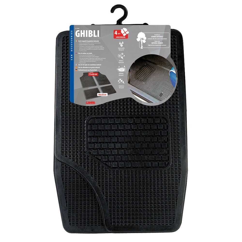 Confezione 4pz. Ghibi, set 4 tappetini in gomma ecologica. Prodotto ecologico in gomma naturale, resistenze alle alte e basse temperature. Dimensioni: anteriore 72x46cm / posteriore 46x33cm.