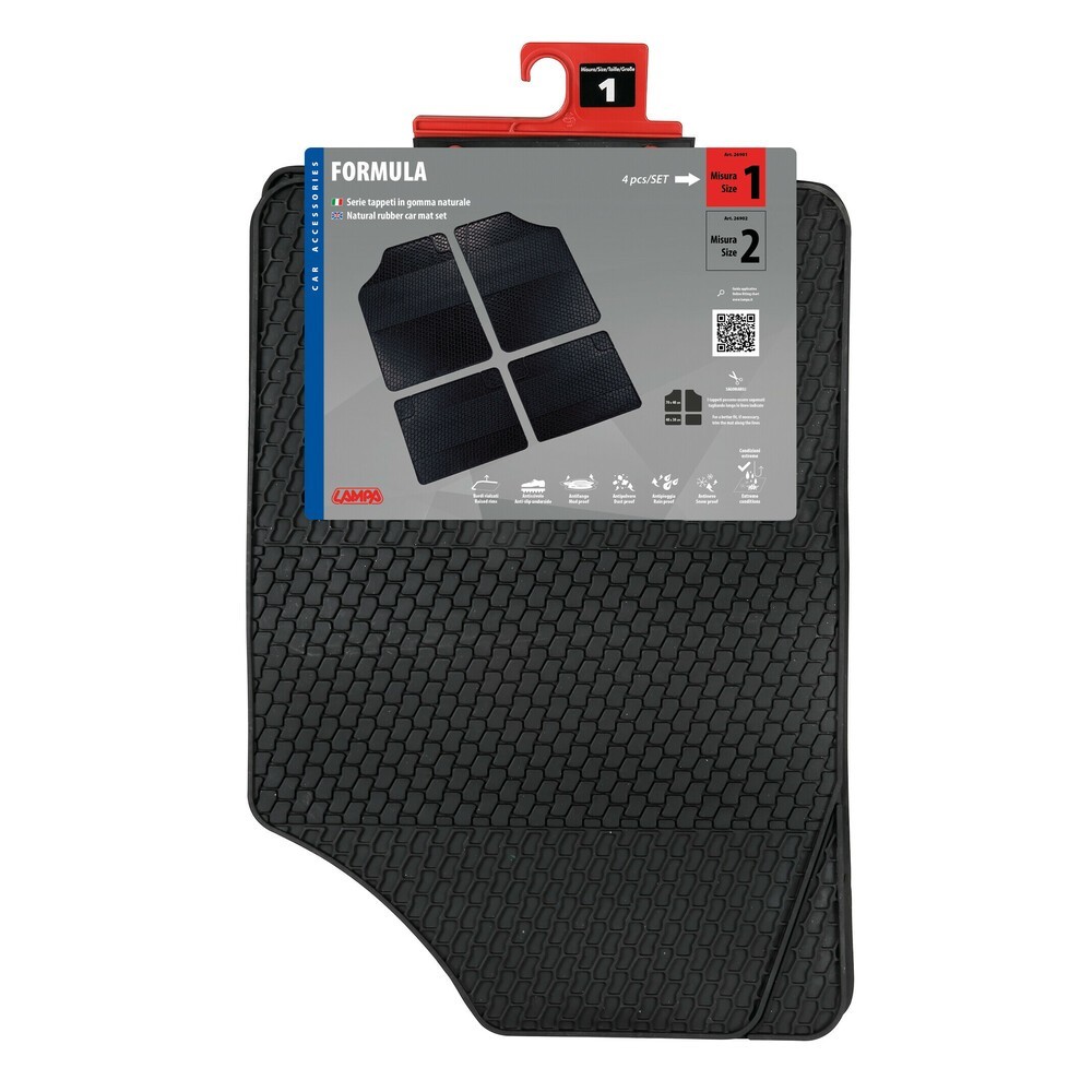 Serie 4 tappeti auto in gomma, bordo laterale in rilievo per una migliore protezione. Retro antiscivolo. Prodotto pretagliato con possibilita' di adattamento all'auto mediante l'utilizzo di forbici. Dimensioni: anteriore 70x48,5cm, posteriore 48,5x38,5. NOTE: grazie alla lista applicazioni in nostro possesso e' possibile scegliere i tappetini adatti alla propria auto, richiedi informazioni prima di procedere con l'acquisto