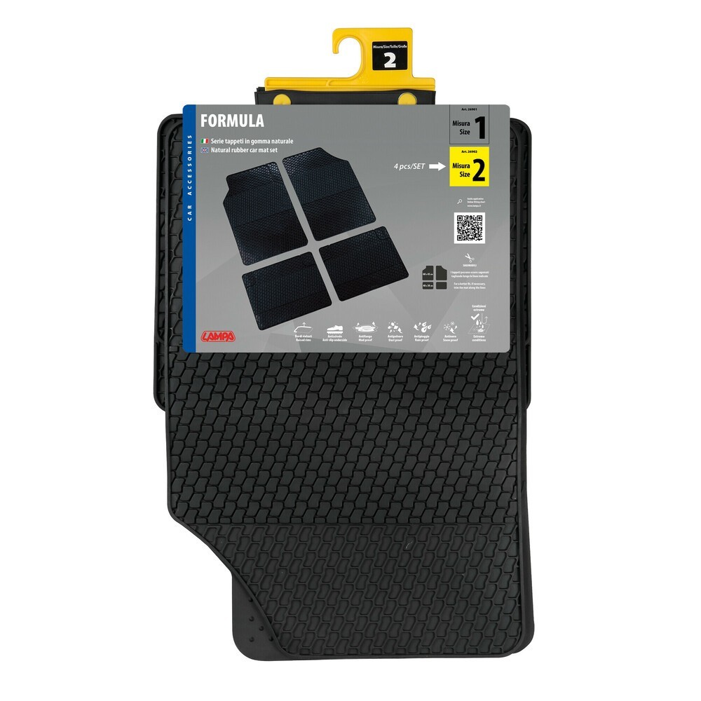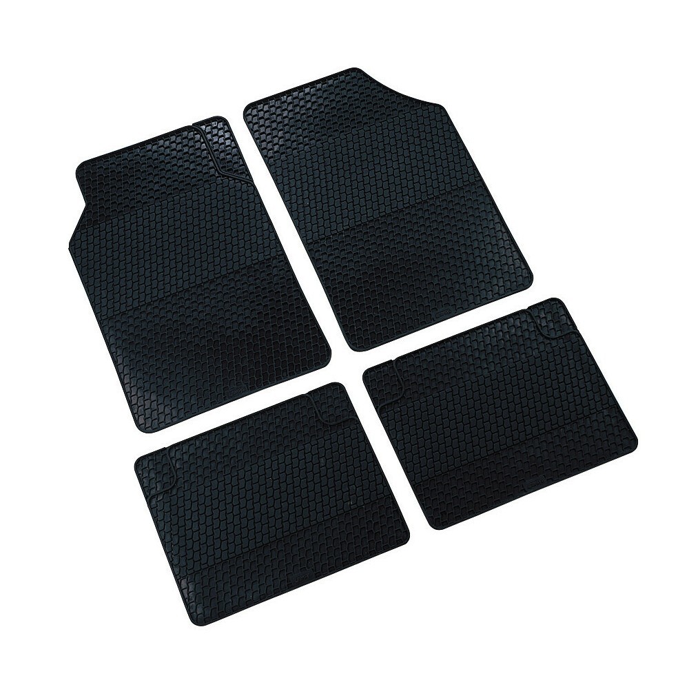 Serie 4 tappeti auto in gomma, bordo laterale in rilievo per una migliore protezione. Retro antiscivolo. Prodotto pretagliato con possibilita' di adattamento all'auto mediante l'utilizzo di forbici. Dimensioni: anteriore 68,5x48,5cm, posteriore 48,5x38,5. NOTE: grazie alla lista applicazioni in nostro possesso e' possibile scegliere i tappetini adatti alla propria auto, richiedi informazioni prima di procedere con l'acquisto