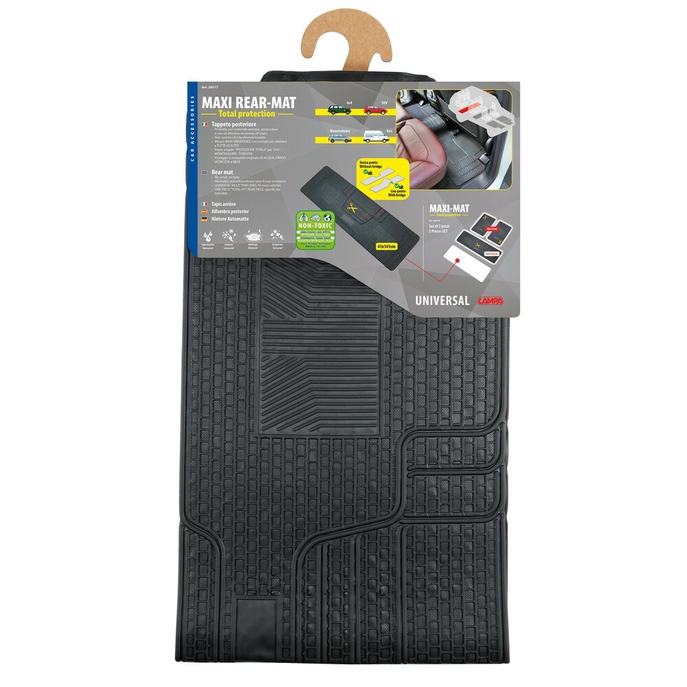 Tappeto di alta qualita' prodotto in PVC atossico, inodore e con un'altissima resistenza all'usura. Misura maxi universale con pretagli per adattarsi a tutte le auto. Non scolora ed e' facilmente lavabile. Pezzo singolo che garantisce protezione totale per Suv, monovolume, furgoni, con o senza ponte. Dimensione: cm 141x41