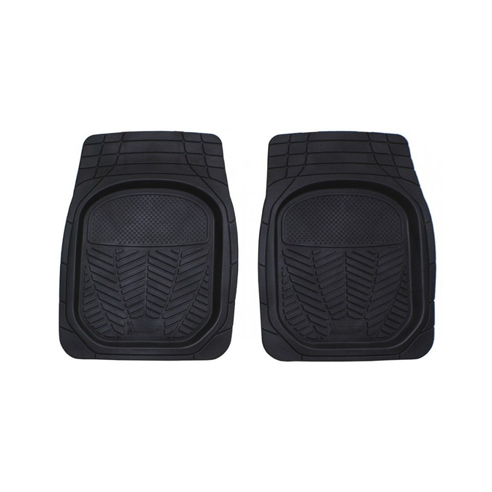 Coppia tappeti anteriori universali in gomma ad alta densita'. Provvisti di linee di taglio per adattarsi alla maggior parte delle vetture. Sistema antiscivolo per un'aderenza perfetta al pianale. I bordi 3D trattengono fango, neve, acqua e sporco. Lavabili.
