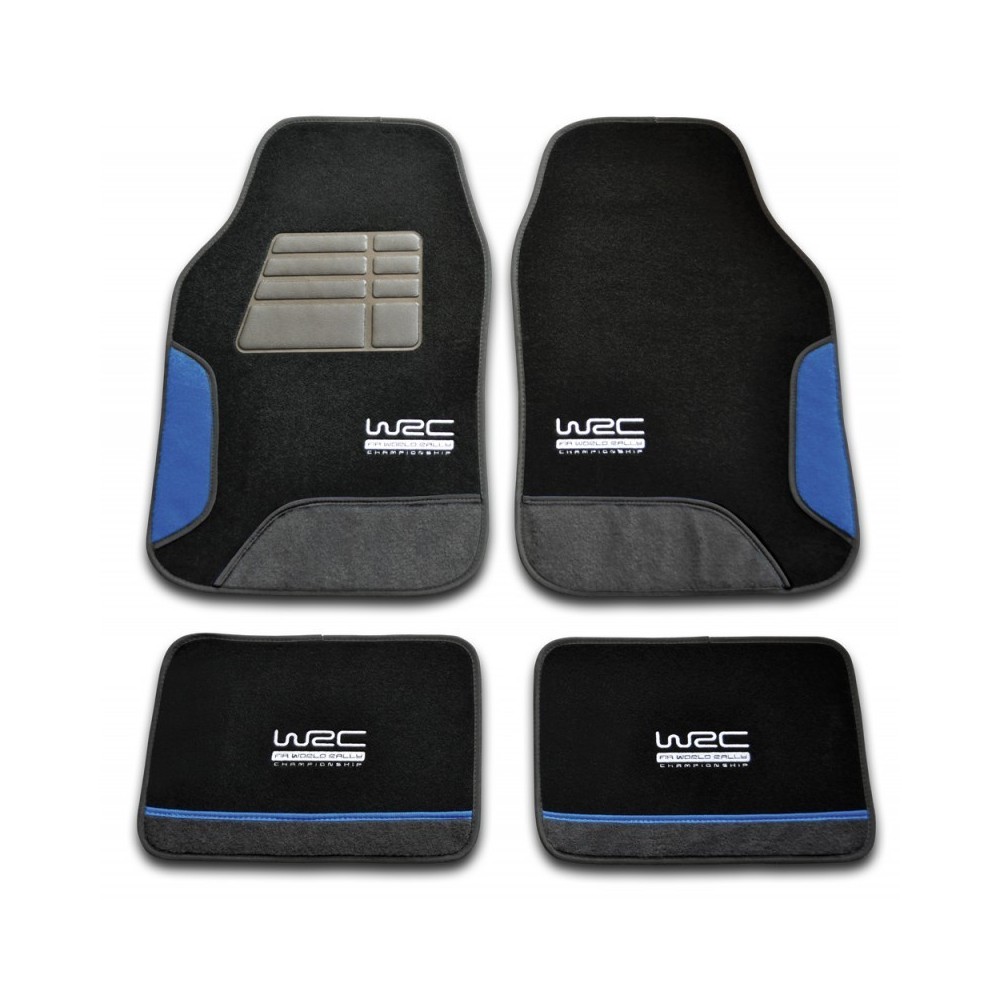 Serie completa 4 tappeti (anteriori+posteriori) universali in moquette velluto nero e grigio con finiture blu per produrre un look effetto racing. Design arricchito dal logo WRC ricamato in rilievo sia sui tappeti anteriori che su quelli posteriori. Inserto battitacco in PVC sul tappeto lato guida. Ottima aderenza al pianale dell'auto: parte inferiore dei tappeti in PVC con grip antiscivolo.