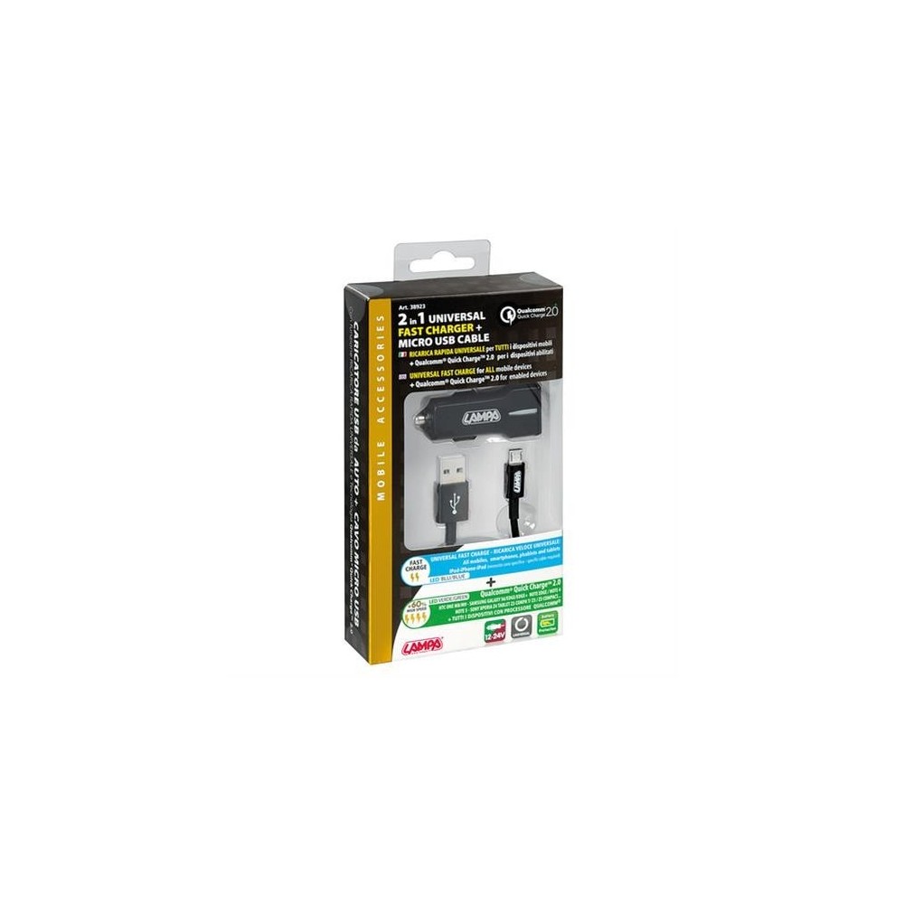 Kit 2 in 1 Micro Usb Qualcomm Quick Charge 12/24V. Caricatore Usb (Qualcomm Quick Charge) con spia a Led. Cavo ricarica e sincronizzazione Micro Usb (100 cm). Protezione da sovraccarico, surriscaldamento, sovratensione e corto circuito. Ricarica veloce universale + Qualcomm Quick Charge. Massima velocita' di ricarica per tutti i dispositivi collegati. Inoltre attiva la tecnologia Qualcomm Quick Charge a tutti i dispositivi abilitati garantendo una ricarica ancora piu' veloce e protetta.
