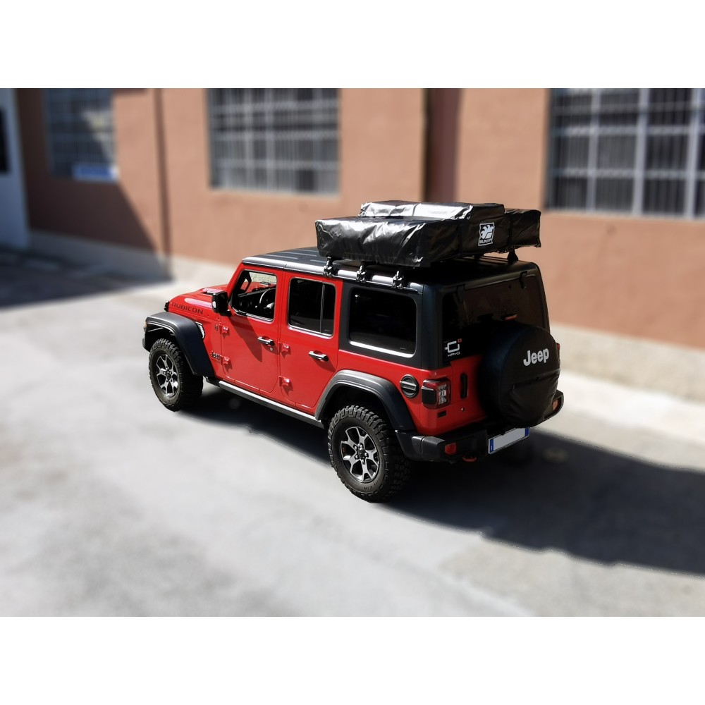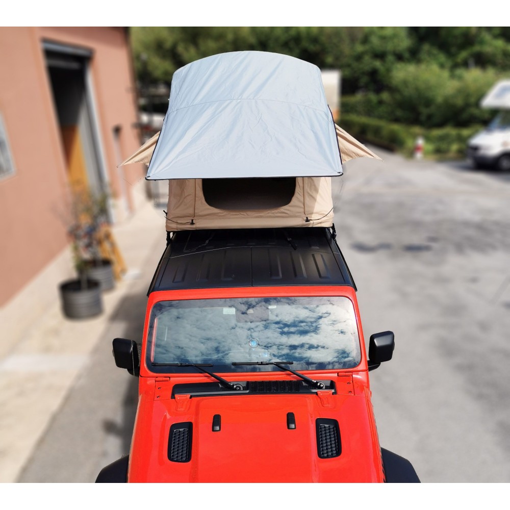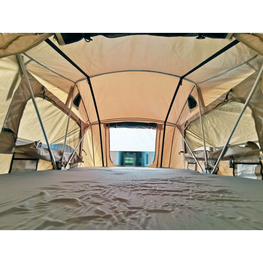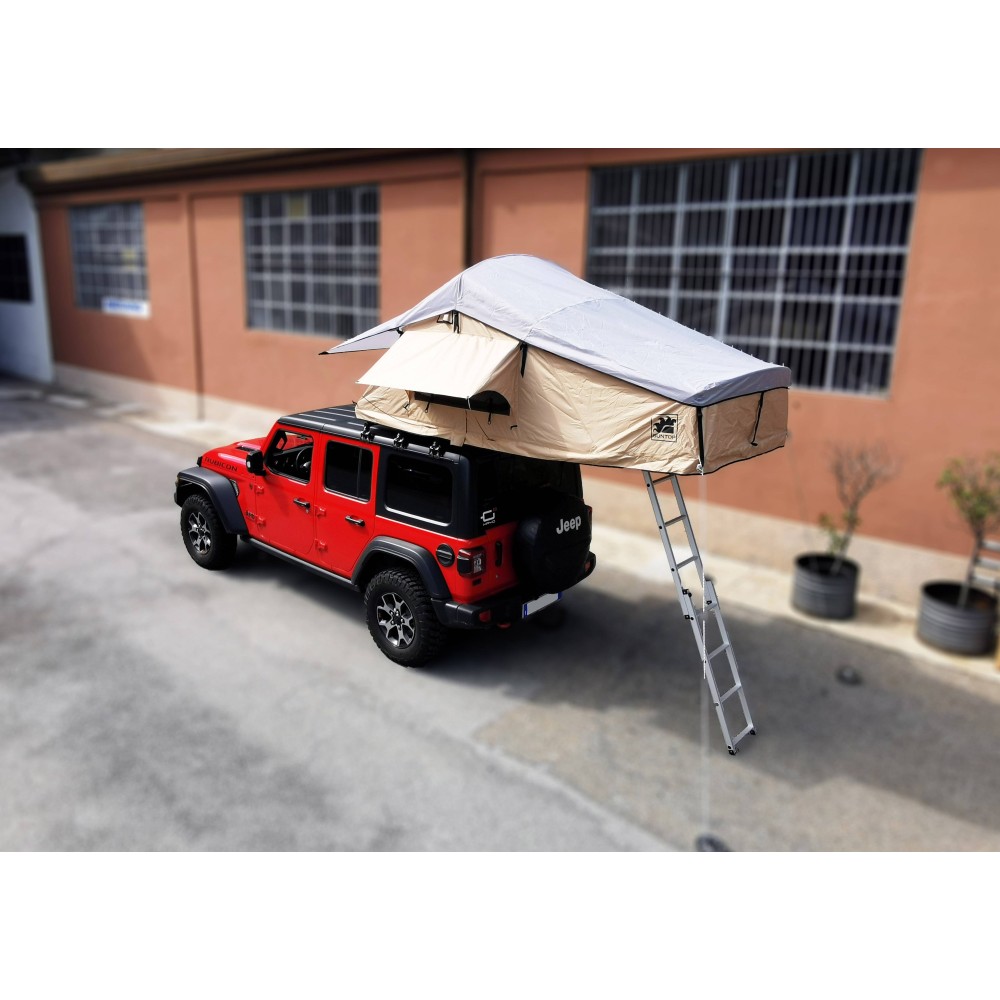 Tenda da tetto completa di spogliatoio realizzata dal miglior produttore asiatico e marchiata SUNTOP, selezionata dopo anni di test nelle condizioni più estreme. I tubi centina con nuovo disegno curvo consentono di avere maggiore volume interno, maggiore abitabilità, migliore dispersione della condensa, migliore dispersione della pioggia evitando accumuli e maggiore tensione dei tessuti. E' una tenda che unisce leggerezza e resistenza, con il corpo abitabile completamente in tessuto Ripstop e un sopra-tetto in Nylon per una doppia protezione dall'acqua e per un buon isolamento dal sole. Apribile sui quattro lati con verandine grazie alle bacchette in metallo fornite. Ha un ottima ventilazione e protezione ed ogni finestra ed ingresso è munita di zanzariera apribile. All'interno ha un materasso da 6 cm molto comodo rivestito in tessuto lavabile. Attrezzata con tasche portaoggetti e ganci ha la predisposizione per fissare degli elastici (forniti) che aiutano durante la chiusura. Fornita con scaletta estendibile che aiuta durante l'apertura. Ha una copertura integrale in pvc nero con cinghie che evitano che sbatta in velocità. Viene fornita completa di spogliatoio annesso inferiore alto 2.2 metri per potersi adattare anche ai veicoli più alti. Lo spogliatoio è aperto sui 4 lati con porte incernierate e zanzariere per mantenere un livello di ventilazione ottimale. Si fissa al corpo principale della tenda tramite una zip perimetrale. Predisposta con due barre in alluminio inferiori munite di attacchi universali per adattarsi a qualsiasi portapacchi o barra da tetto. La tenda chiusa misura 142x122x H 34 cm ( compresa la scaletta ), ha un peso di circa 45Kg