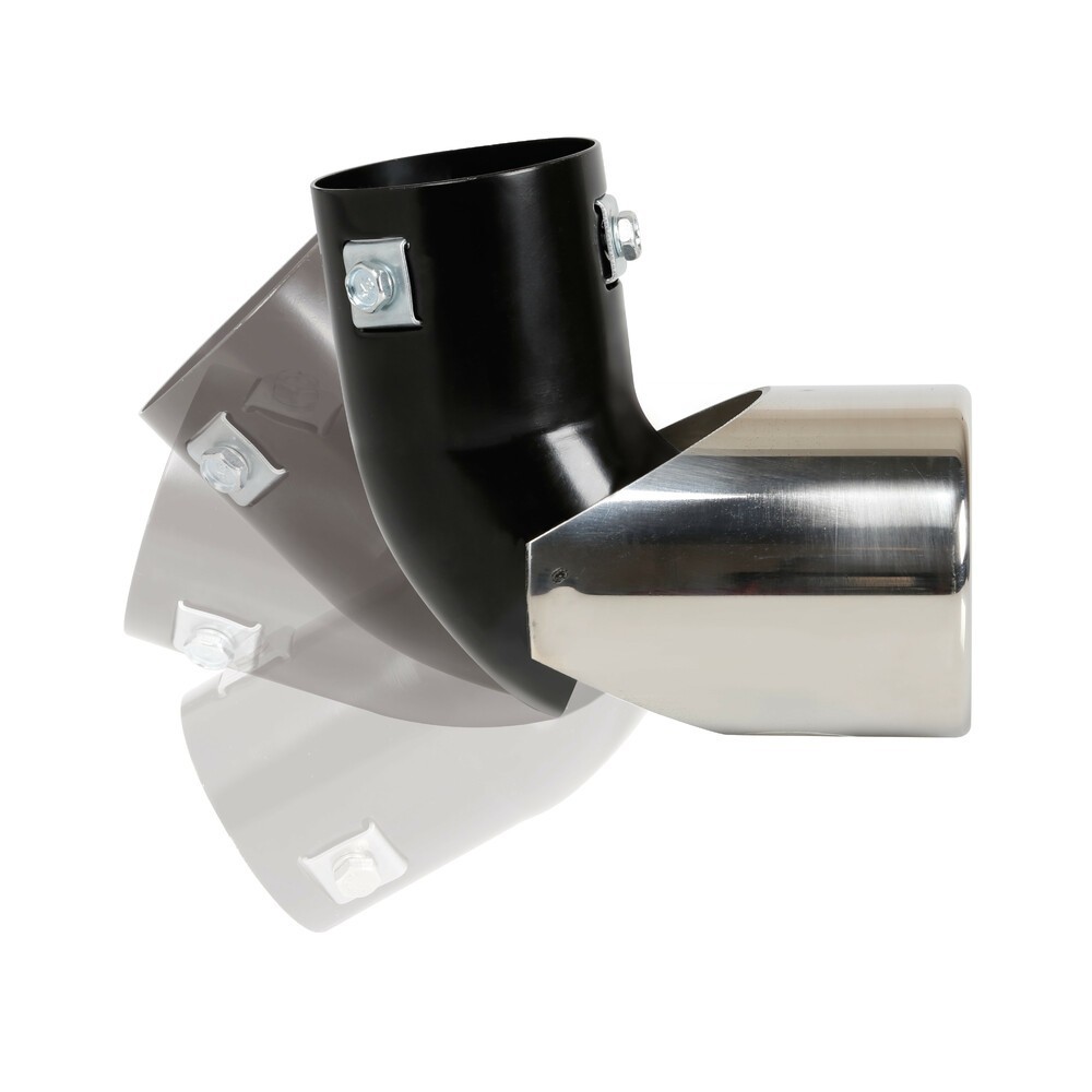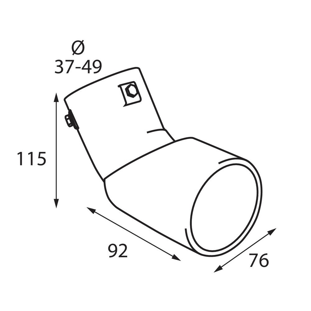 Terminale di scarico in acciaio inox lucidato, modello TS-61. Diametro ingresso: 37-49mm. Con sistema di regolazione dell'angolo di curvatura (140 gradi). Specifico per vetture con sistema di scarico ricurvo verso il basso oppure parzialmente nascosto dal paraurti. Dimensioni come da foto