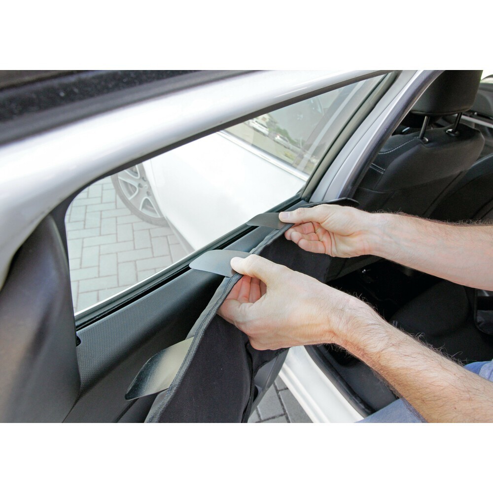 Protezioni per portiere posteriori universali per la maggior parte delle auto. Si montano in pochissimi secondi mediante appositi incastri nella sede del finestrino e velcro adesivo, proteggono da graffi, bava e sporco. Lavabili con acqua corrente ed una spazzola. Tasche multifunzione. Dimensione: 70x43cm