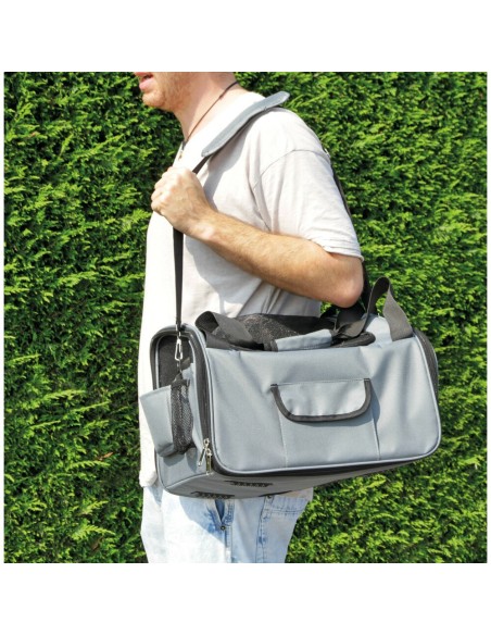 Seggiolino e trasportino per animali per sedile auto anteriore o posteriore. Universale, puo' essere utilizzato come trasportino grazie alle maniglie e alla tracolla. Si monta in pochi secondi fissandolo alla cintura di sicurezza. Ripiegato occupa pochissimo spazio. Tasche multifunzione e rete per consentire la circolazione dell'aria. Lavabile con acqua corrente ed una spazzola. Dimensione: 40x38xH28cm