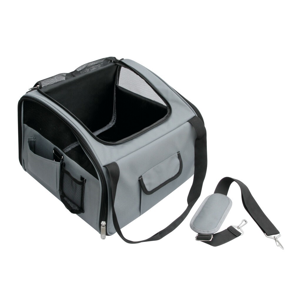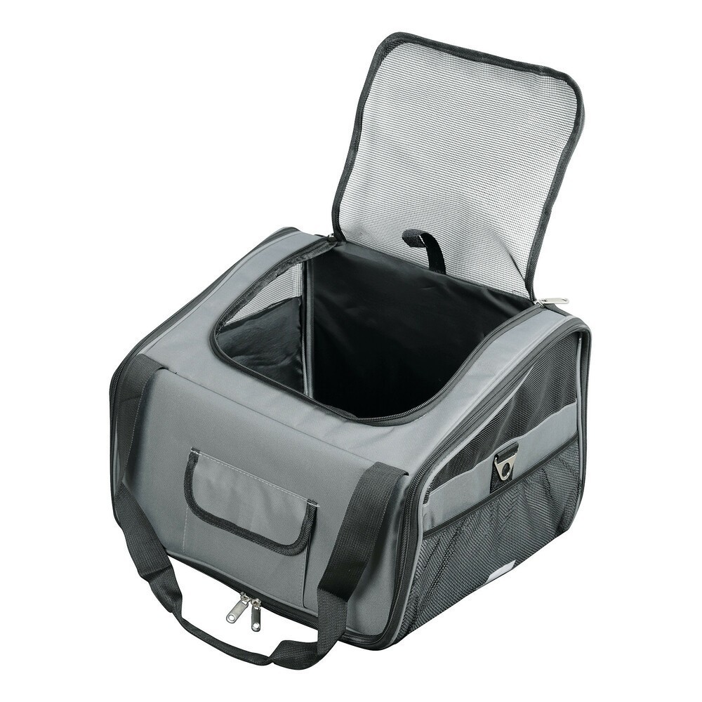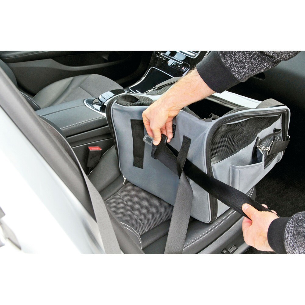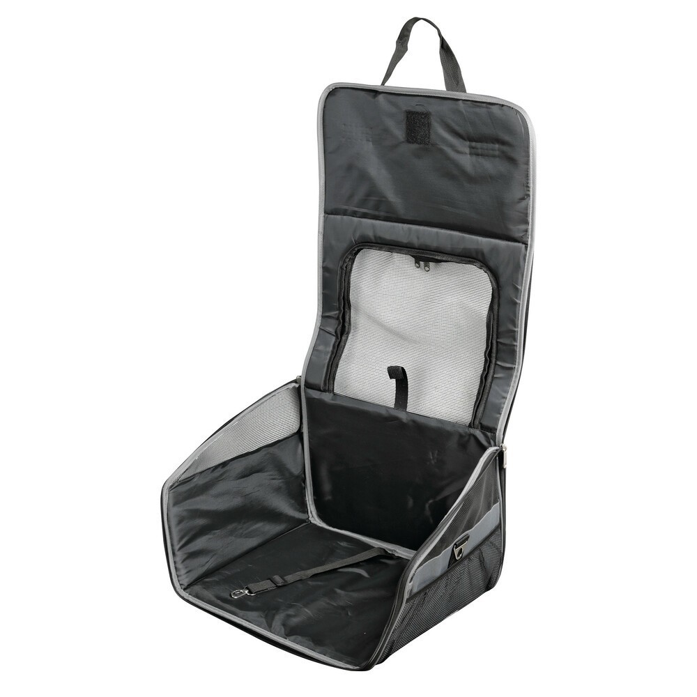 Seggiolino e trasportino per animali per sedile auto anteriore o posteriore. Universale, puo' essere utilizzato come trasportino grazie alle maniglie e alla tracolla. Si monta in pochi secondi fissandolo alla cintura di sicurezza. Ripiegato occupa pochissimo spazio. Tasche multifunzione e rete per consentire la circolazione dell'aria. Lavabile con acqua corrente ed una spazzola. Dimensione: 40x38xH28cm