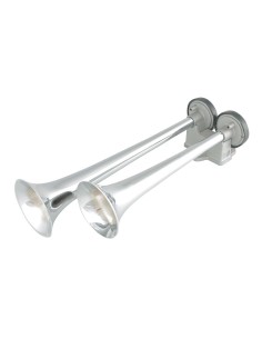Tromba elettropneumatica a due cornetti con suono unito marca Marco modello CL2. Completa di compressore elettrico, rele', tubo e accessori di montaggio. Cornetti in metallo cromato. Caratteristiche: 118db, 8amp. Frequenza 692/756Hz, Peso 1,2kg, Tensione di alimentazione 24V. Omologazione R. 28 ECE/ONU. Lunghezza 17cm escluso compressore