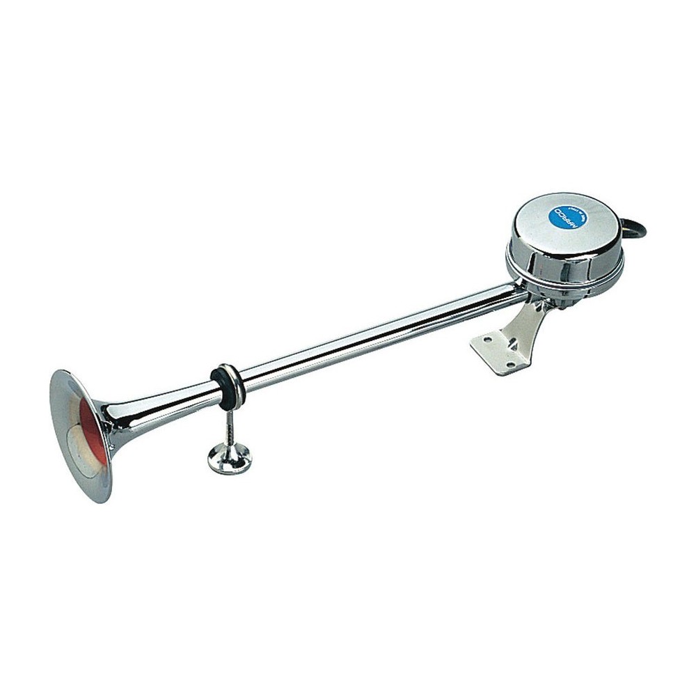 Tromba elettromagnetica singola con cornetto in acciaio inox marca Marco modello EM1. Gruppo sonoro di elevata potenza accuratamente protetto e costruito con materiale anticorrosione. Completa di staffa di montaggio. Caratteristiche: Lunghezza 47cm, Alimentazione 24V, Corrente 4A, 118db, frequenza 320Hz. Disponibile anche in versione 12V