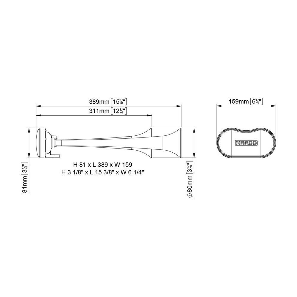 Tromba elettropneumatica marca Marco modello K2 a due cornetti a suono alternato tipo pullman. Completa di compressore elettrico, rele', tubo e accessori di montaggio. Cornetti in metallo cromato. Lunghezza tromba 1: 389mm. Lunghezza tromba 2: 311mm. Diametro padiglioni: 80mm. Peso: 2Kg