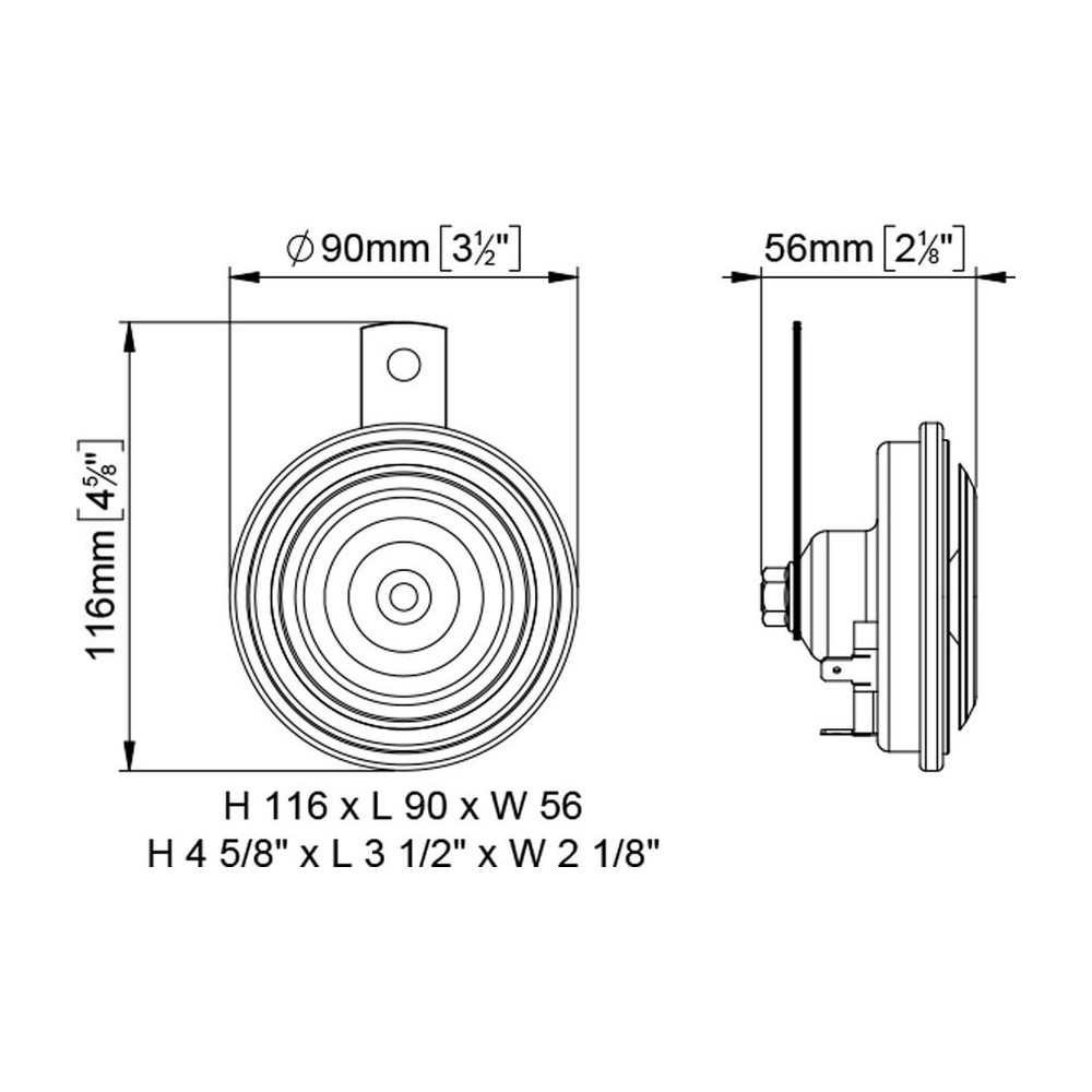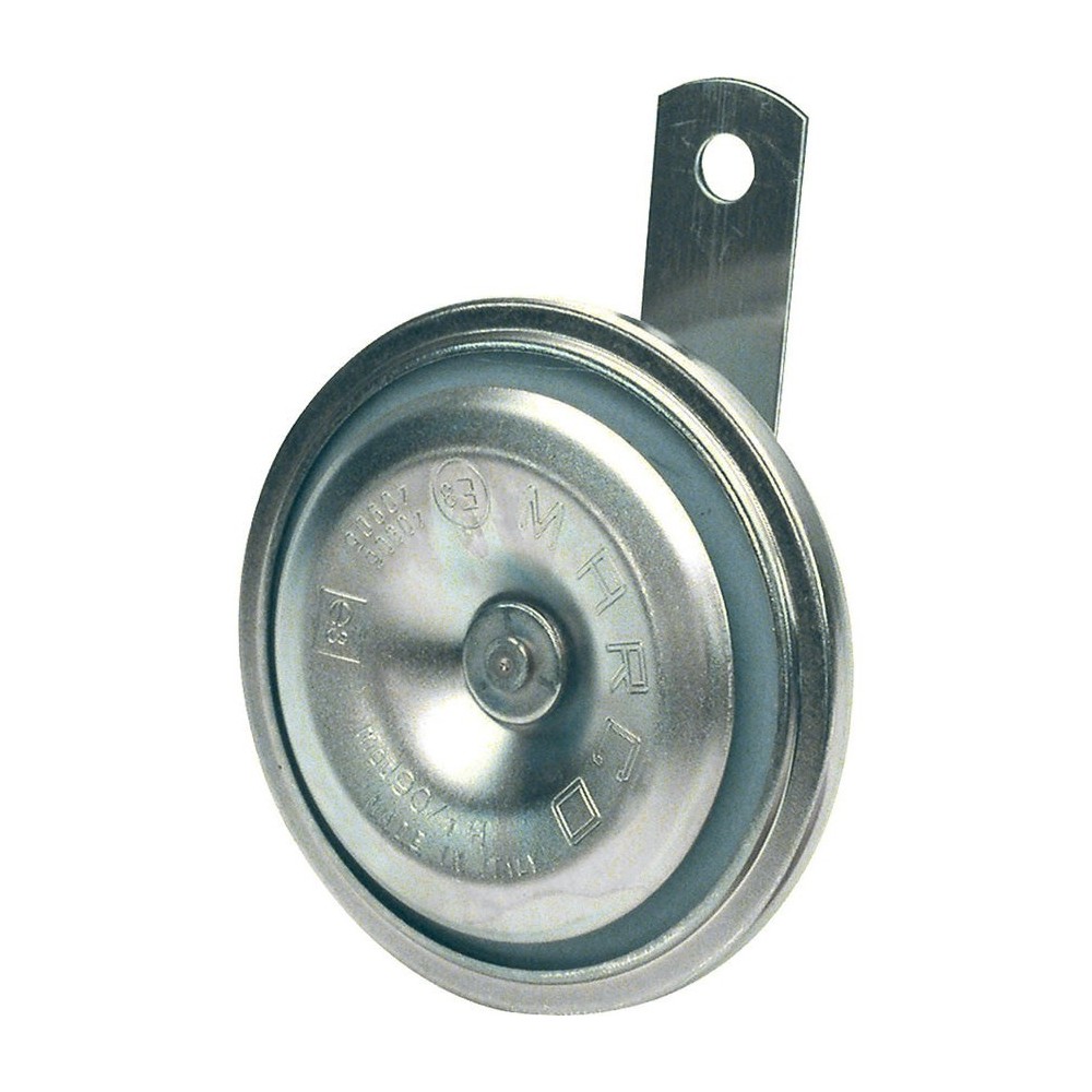 Clacson avvisatore elettromagnetico a disco marca Marco modello 90/1H diametro 90mm a due morsetti. Tono alto. Completo di staffa. Caratteristiche: alimentazione 36-48V, corrente 1A, 112db, frequenza 450Hz, Peso 0,3kg. Omologazione R. 28 ECE/ONU