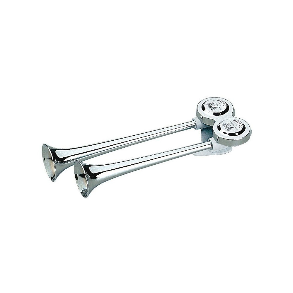 Tromba bitonale marca Marco modello KS2 ad aria compressa per montaggio esterno. Cornetti in metallo cromato. Completa di accessori di fissaggio, valvole di comando escluse. Caratteristiche: lunghezza 440mm, padiglione diametro 80mm, 116db, Frequenza 282/321Hz, Peso 1,2kg, Omologazione E3 37585