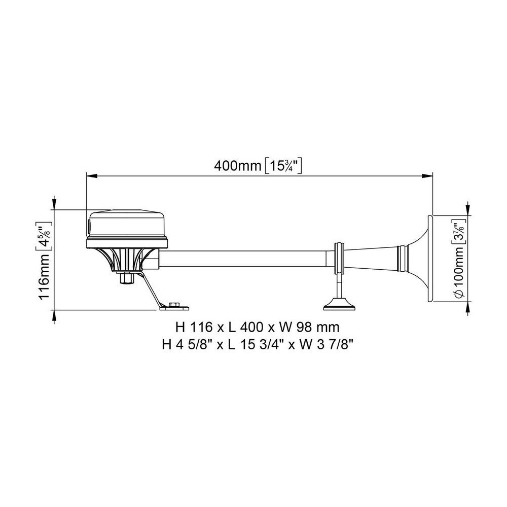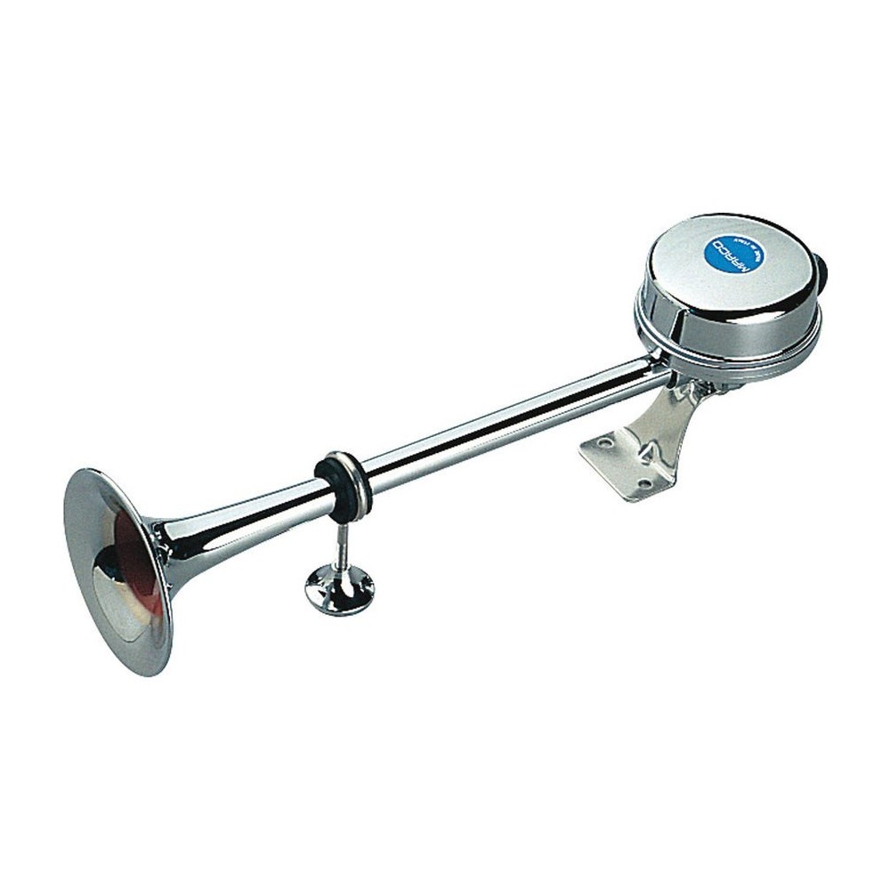 Tromba elettromagnetica singola con cornetto in acciaio inox marca Marco modello EM2. Gruppo sonoro di elevata potenza accuratamente protetto e costruito con materiale anticorrosione. Completa di staffa di montaggio. Caratteristiche: Lunghezza 40cm, Alimentazione 12V, Corrente 5A, 118db, frequenza 370Hz. Disponibile anche in versione 24V