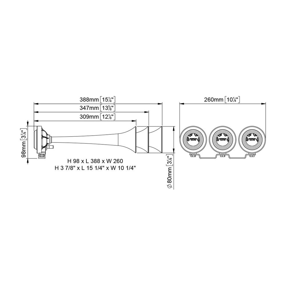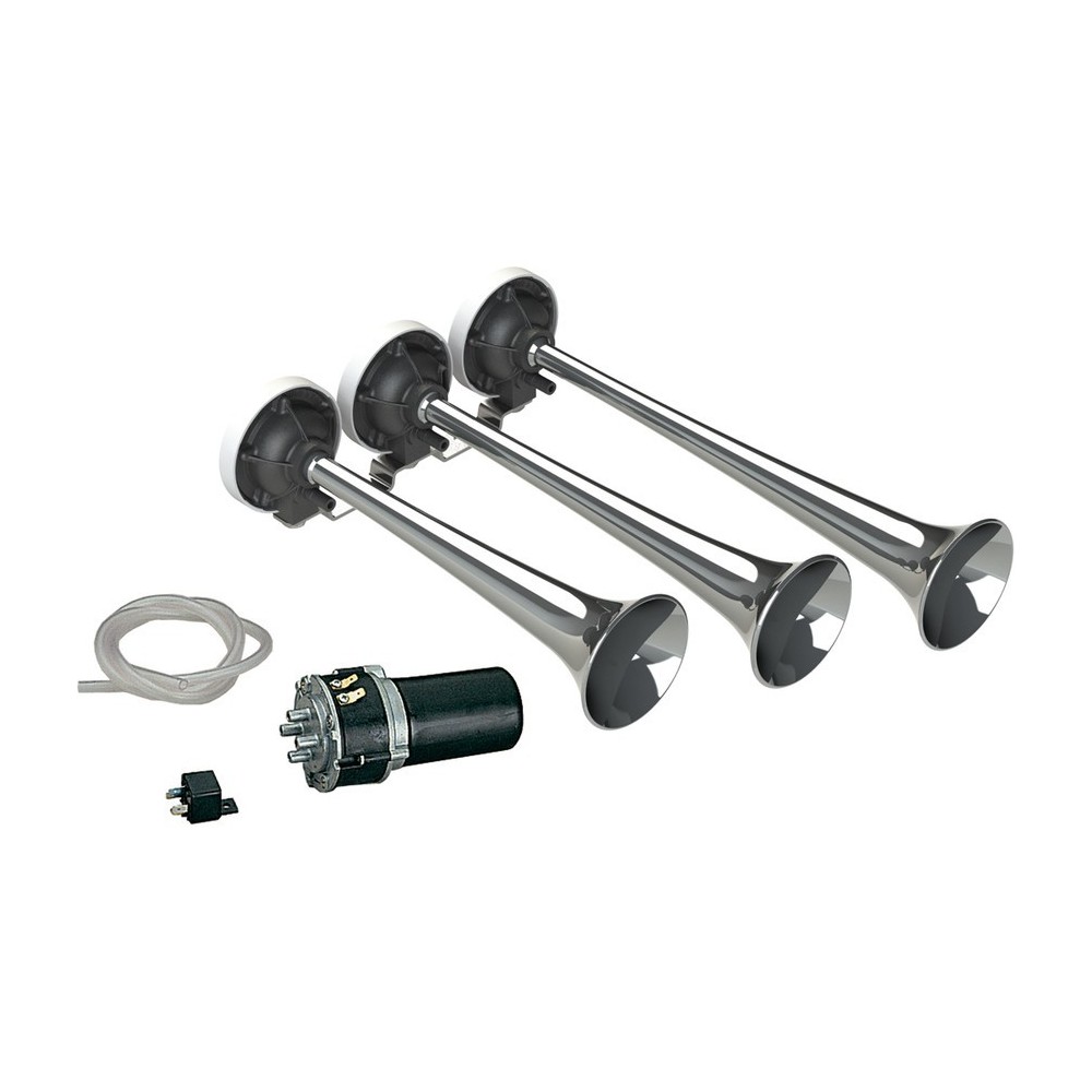 Tromba elettropneumatica a tre suoni marca Marco. Suoni in successione o in accordo. Completa di compressore elettrico, rele', tubo e accessori di montaggio. Cornetti in metallo cromato. Lunghezza tromba 1: 388mm. Lunghezza tromba 2: 347mm. Lunghezza tromba 3: 309mm. Larghezza totale: 260mm. Diametro padiglioni: 80mm. Peso: 2,2Kg