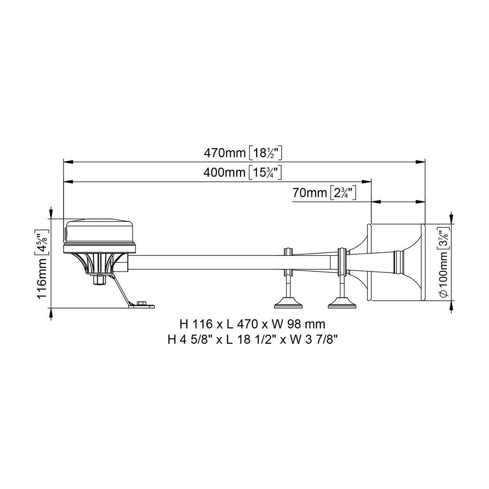 Tromba elettromagnetica con cornetto in acciaio inox. Gruppo sonoro di elevata potenza accuratamente protetto e costruito con materiale anticorrosione. Completa di staffa di montaggio. Tensione 12V, assobimento 10A, Hz 370/320, dB 121. Lunghezza 400/470mm