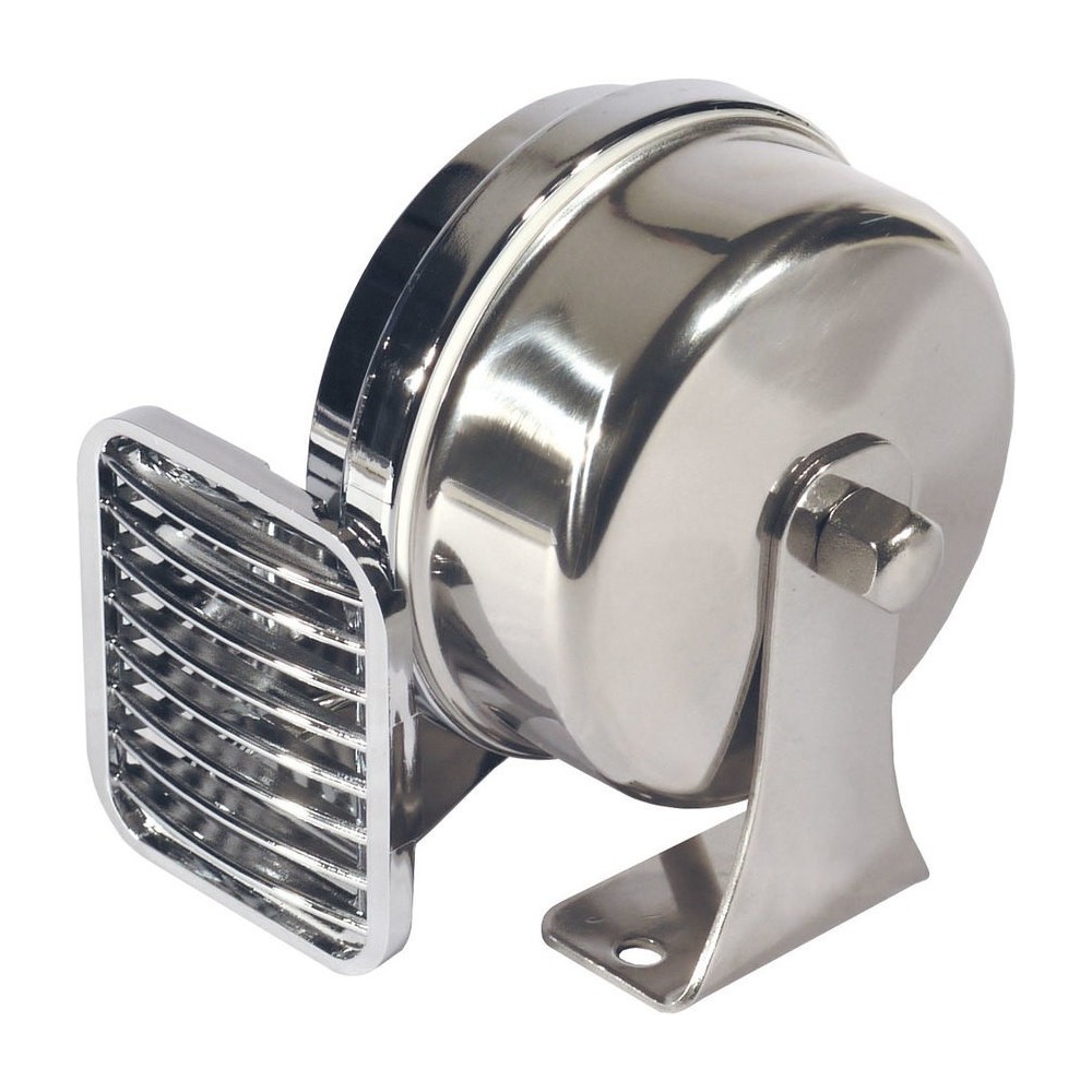MT1-H tromba cromata, tono alto. Gruppo sonoro accuratamente protetto e costruito con materiale anticorrosione. Cromatura resistente alla salsedine. Completa di staffa di fissaggio. Tensione 12V, assorbimento 5A, Hz 490, dB 114, padiglione 80x50mm