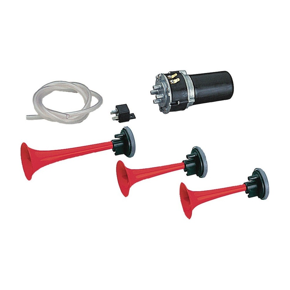 Tromba elettropneumatica a tre cornetti a suono alternato o unito. Completa di compressore elettrico, rele', tubo e accessori di montaggio. Cornetti in plastica di alta resistenza. Tensione 12V, assorbimento 18A, 600/735/785 Hz, 117dB, padiglione diametro 70mm, peso 1.4kg