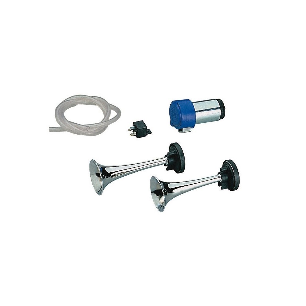 Tromba elettropneumatica marca Marco modello CL2 a due cornetti in metallo cromato con suono unito. Completa di compressore elettrico, rele', tubo e accessori di montaggio. Caratteristiche: tensione di alimentazione 12V, Amperaggio 16A, Db 118, Hz 692/756, Peso 1,2kg