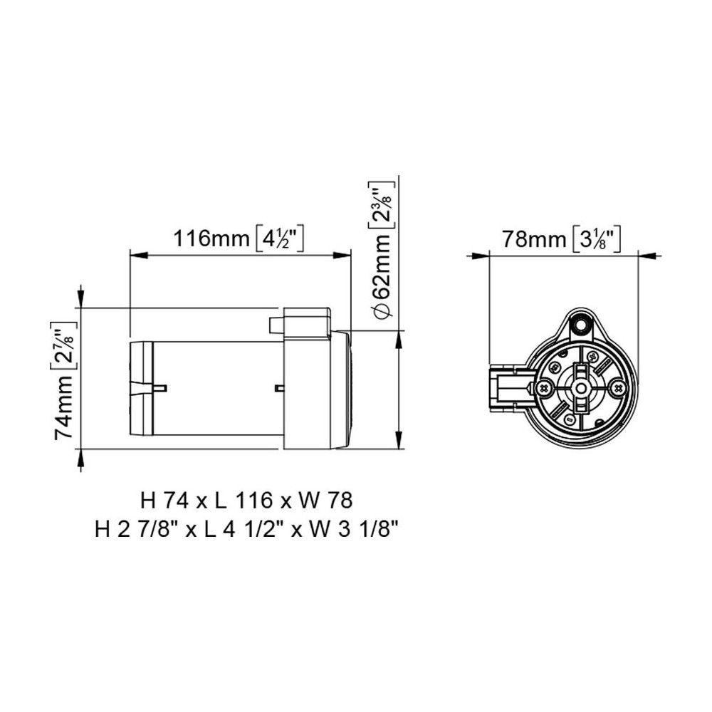 Compressore con rotore sinterizzato marca Marco per trombe 12V. Caratteristiche: Pressione max 1 bar - 14.5 psi, Protezione IP 44, Max potenza 240W, Dimensioni (mm) 116x74x78.
