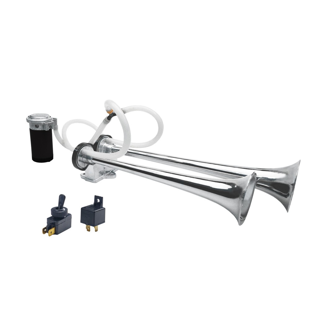 Tromba mono-tono compatibile con veicoli a 12V, emette un potete suono da 118db. Dotata di compressore ad alte prestazioni e trombe in alluminio. Dimensioni: 385x141x84mm - Diametro 50mm