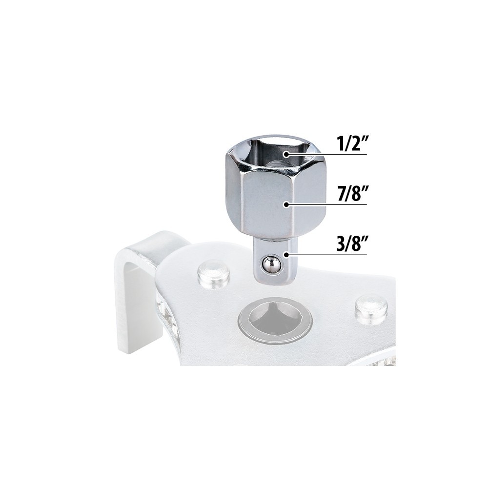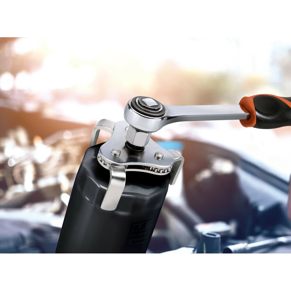 Chiave per la rimozione o l'installazione facilitata di filtri. Indispensabile quando l'accesso al filtro puo avvenire solo dall'alto e non di lato. Grazie alle tre ganasce regolabili riesce a rimuovere anche i filtri bloccati. Adatta solo per filtri metallici. Dotata di un adattatore per l'azionamento, che può essere utilizzato con cricchetti o chiavi con attacco quadro da 1/2'' o 3/8''