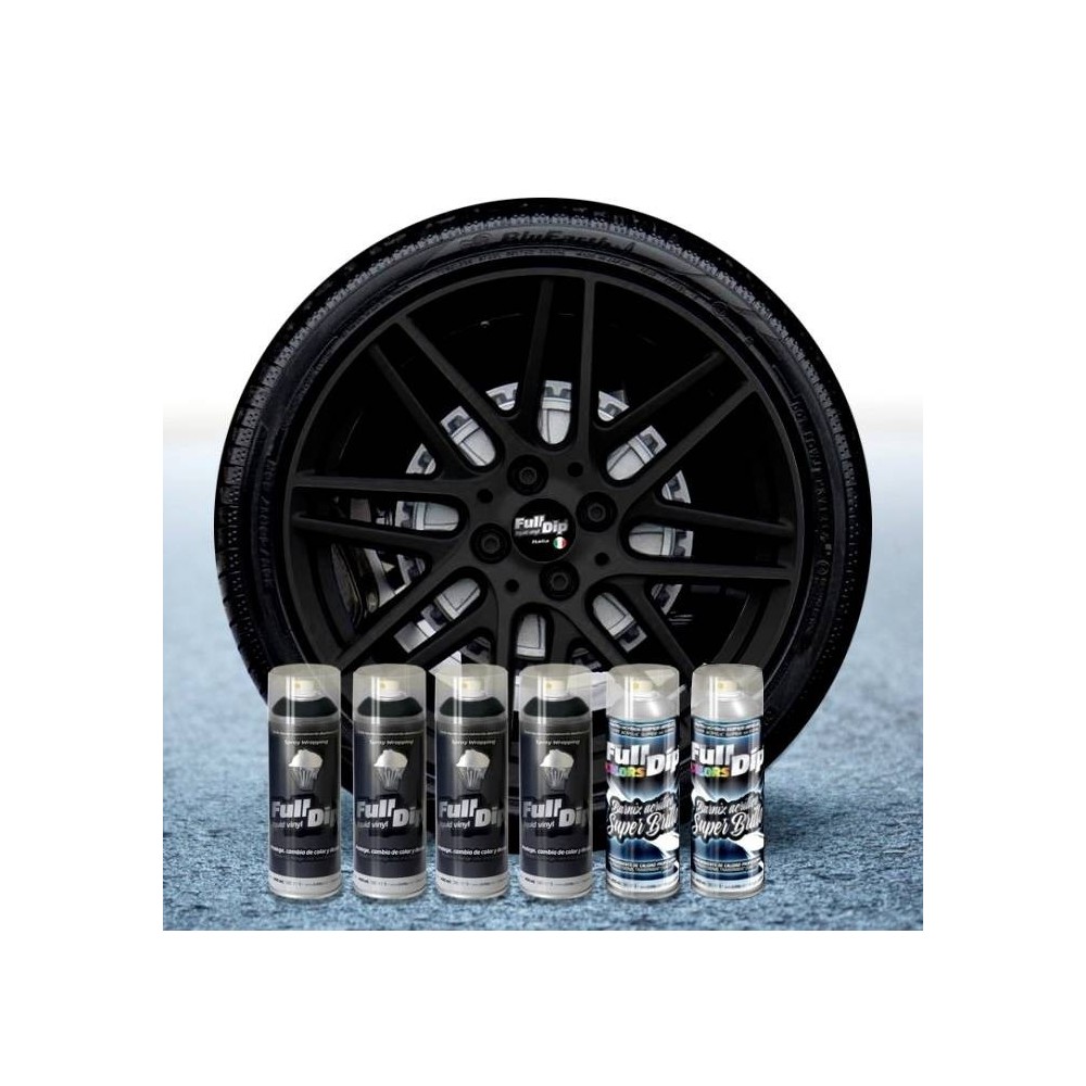 Confezione di 4 bombolette (400ml x4) di Full Dip nero opaco + 2 lucidi TOP COAT ( 400m x2). Confezione studiata appositamente per dippare i tuoi 4 cerchioni e di fornire l'adeguata protezione. Con 4 bombolette puoi verniciare 4 cerchi di qualsiasi misura, con le restanti 2 bombolette di trasparente lucido top coat puoi coprire i 4 cerchi gia' dippati di nero opaco. ATTENZIONE: il TOP COAT LUCIDO di per se' non e' removibile, ma lo diventa solo su 5-7 mani di full dip. Facilissimo da applicare anche per un principiante, Full Dip si caratterizza per la finitura estremamente liscia che le fa guadagnare il nome di vinile liquido. Una bomboletta di top coat e' sufficiente per tutti e 4 i cerchioni, nel kit e' inclusa un altra bomboletta top coat in caso ci fosse la necessita di fare il quinto cerchione di scorta. Applicazione: Agitare energicamente prima dell'uso per circa 1 minuto, dare una prima spruzzata a vuoto, spruzzare su superfici pulite ed asciutte in maniera molto leggera ad una distanza di 20 cm, attendere 10-15 minuti tra una mano e l'altra (si raccomandano almeno 5-7 mani), la vernice sara' completamente asciutta dopo 24 ore. Dopo aver atteso 24h spruzzare il top coat lucido, dare una prima mano leggerissima, dopo 5 minuti dare una seconda mano piu' pesante, dopo altri 5 minuti dare la terza ed ultima mano (dare la stessa quantita' della seconda mano), la vernice sara' completamente asciutta dopo 24 ore. Si rimuove come un semplice adesivo