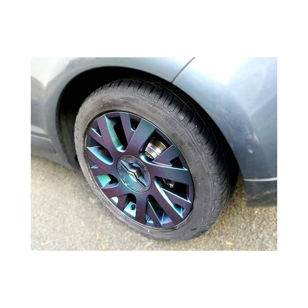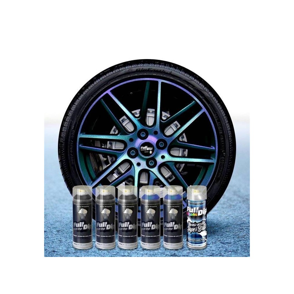 Confezione di 2 bombolette (400ml) di Full Dip hardcore camaleon + 3pz nero opaco da utilizzare come base + 1pz lucido TOP COAT. Applicazione: agitare energicamente prima dell'uso per circa 1 minuto, dare una prima spruzzata a vuoto. Spruzzare le tre bombolette di nero su tutti e 4 i cerchioni per creare una base. Attendere 10-15 minuti tra una mano e l'altra (si raccomandano almeno 5-7 mani). Finite le 3 bombolette nere, attendere almeno 30' e ripetere la stessa procedura con i 2 hardcore camaleon. La vernice sara' completamente asciutta dopo 24 ore. Attese le 24 ore, spruzzare il top coat lucido. Dare una prima mano leggerissima. Dopo 5 minuti dare una seconda mano piu' pesante. Dopo 5 minuti dare la terza ed ultima mano (dare la stessa quantita' della seconda mano). Il trasparente sara' completamente asciutto dopo 24 ore.