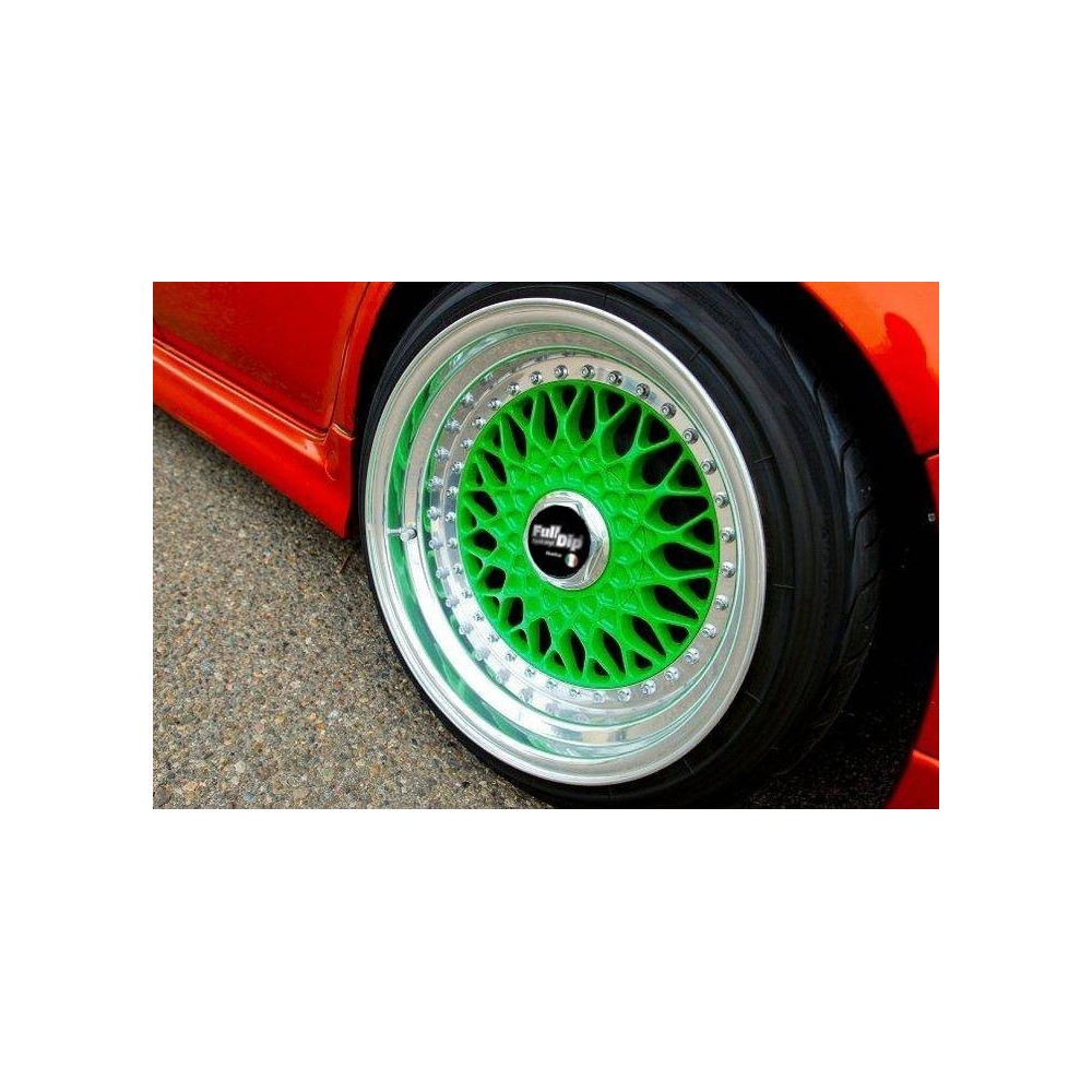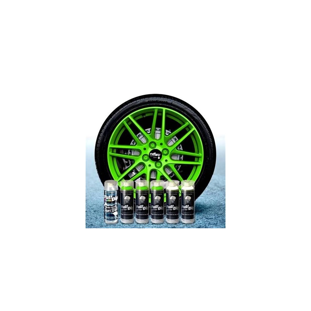 Confezione di 3 bombolette (400ml) di Full Dip verde fluo + 2pz bianco opaco da usare come base e 1 lucido TOP COAT. ATTENZIONE: I COLORI FLUO SBIADISCONO NEL TEMPO CON PIU' FACILITA'. Applicazione: Agitare energicamente prima dell'uso per circa 1 minuto, dare una prima spruzzata a vuoto. Spruzzare in maniera molto leggera ad una distanza di 20 cm le due bombolette di bianco. Attendere 10-15 minuti tra una mano e l'altra (si raccomandano almeno 5-7 mani). Terminato il bianco, attendere almeno 30' ed usare le 3 bombolette di fluo alla stessa maniera sui 4 cerchioni. La vernice sara' completamente asciutta dopo 24 ore. Attese le 24h, spruzzare il top coat lucido. Dare una prima mano leggerissima. Dopo 5 minuti dare una seconda mano piu' pesante. Dopo 5 minuti dare la terza ed ultima mano (dare la stessa quantita' della seconda mano). Il trasparente sara' completamente asciutto dopo 24 ore.