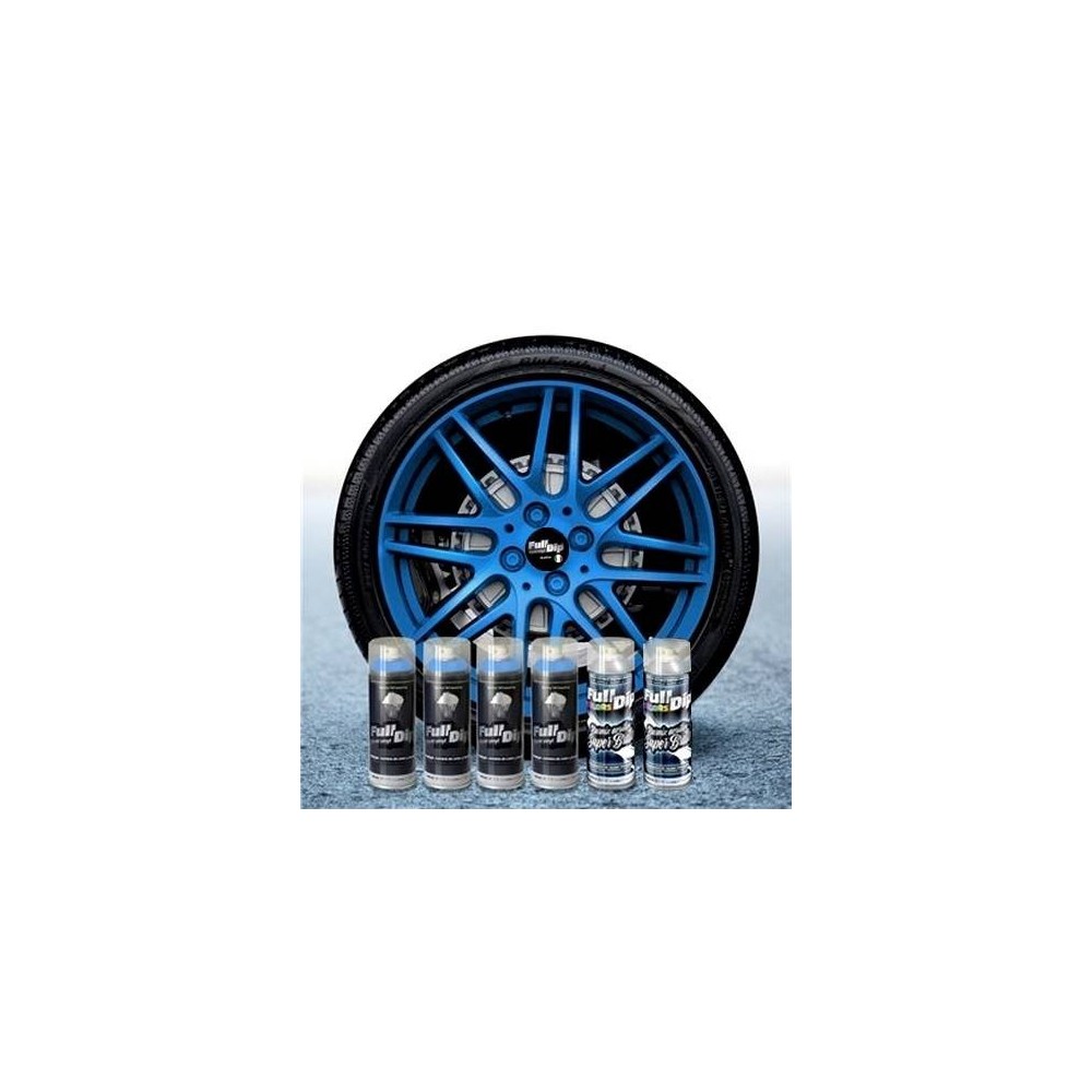 Confezione di 4 bombolette (400ml x4) di Full Dip azzurro metallizzato + 2 lucidi TOP COAT ( 400m x2). Confezione studiata appositamente per dippare i tuoi 4 cerchioni e di fornire l'adeguata protezione. Con 4 bombolette puoi verniciare 4 cerchi di qualsiasi misura, con le restanti 2 bombolette di trasparente lucido top coat puoi coprire i 4 cerchi gia' dippati di nero opaco. ATTENZIONE: il TOP COAT LUCIDO di per se' non e' removibile, ma lo diventa solo su 5-7 mani di full dip. Facilissimo da applicare anche per un principiante, Full Dip si caratterizza per la finitura estremamente liscia che le fa guadagnare il nome di vinile liquido. Una bomboletta di top coat e' sufficiente per tutti e 4 i cerchioni, nel kit e' inclusa un altra bomboletta top coat in caso ci fosse la necessita di fare il quinto cerchione di scorta. Applicazione: Agitare energicamente prima dell'uso per circa 1 minuto, dare una prima spruzzata a vuoto, spruzzare su superfici pulite ed asciutte in maniera molto leggera ad una distanza di 20 cm, attendere 10-15 minuti tra una mano e l'altra (si raccomandano almeno 5-7 mani), la vernice sara' completamente asciutta dopo 24 ore. Dopo aver atteso 24h spruzzare il top coat lucido, dare una prima mano leggerissima, dopo 5 minuti dare una seconda mano piu' pesante, dopo altri 5 minuti dare la terza ed ultima mano (dare la stessa quantita' della seconda mano), la vernice sara' completamente asciutta dopo 24 ore. Si rimuove come un semplice adesivo