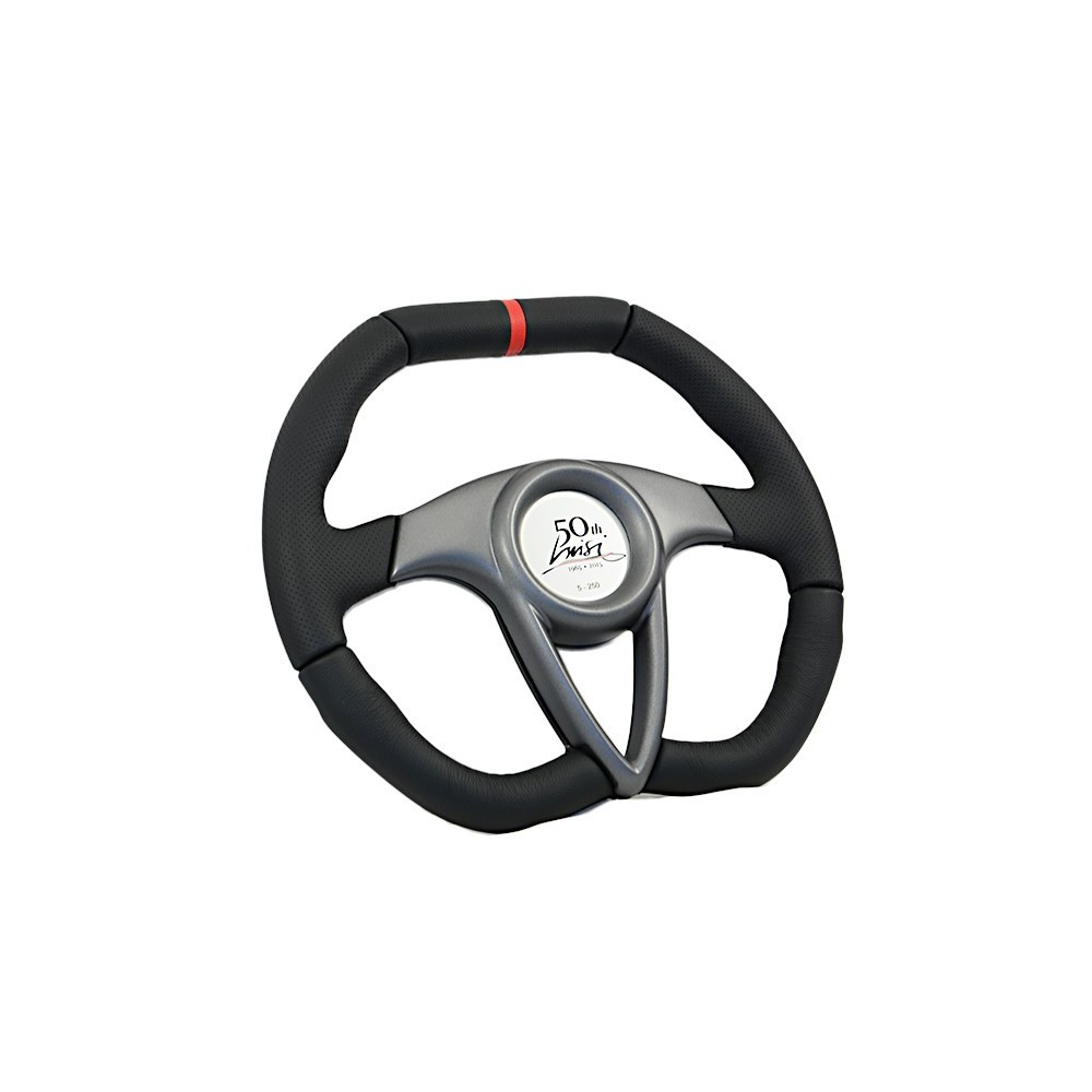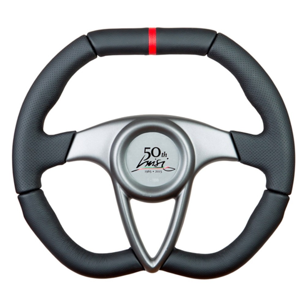 Marca: Luisi - Modello: 50 Anniversario - Diametro volante: 350mm / 13.8'' - Materiale: Pelle nera e pelle traforata nera con rigo centrale rosso. Razze colore nero anodizzato, coprirazza in materiale composito verniciato grigio. Pulsante numerato progressivamente. NOTE: VOLANTE A TIRATURA LIMITATA. ATTENZIONE: Si consiglia l'acquisto del relativo mozzo di marca Luisi specifico per auto.