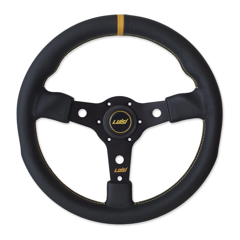 Marca: Luisi - Modello: Racing Corsa - Diametro volante: 350mm / 13.8'' - Materiale: Pelle. Altezza calice: 38mm. Note: corona in pelle, rigo centrale giallo e razza anodizzata nera . ATTENZIONE: Si consiglia l'acquisto del relativo mozzo di marca Luisi specifico per auto.