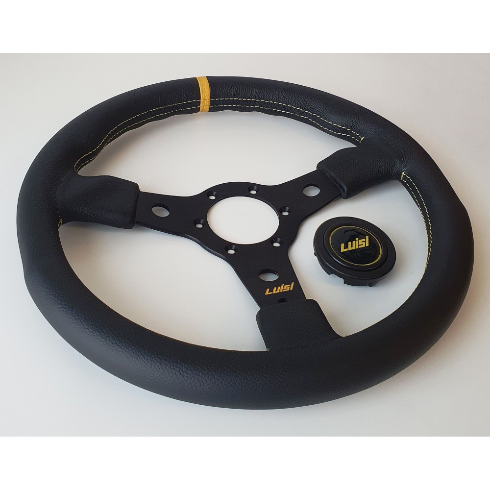 Marca: Luisi - Modello: Racing Corsa - Diametro volante: 350mm / 13.8'' - Materiale: Pelle. Altezza calice: 38mm. Note: corona in pelle, rigo centrale giallo e razza anodizzata nera . ATTENZIONE: Si consiglia l'acquisto del relativo mozzo di marca Luisi specifico per auto.