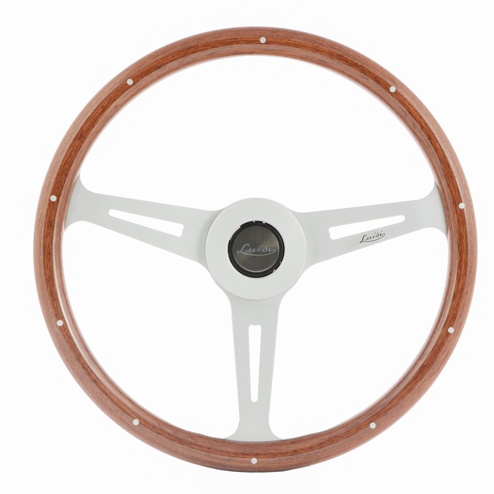 Marca: Luisi - Modello: Classic - Diametro volante: 370mm / 14.56'' su cui sono stati inseriti rivetti in alluminio - Profondita': 31mm - Materiale: Mogano. Razze e copri-viti in alluminio anodizzati argento. ATTENZIONE: Si consiglia l'acquisto del relativo mozzo di marca Luisi specifico per auto.