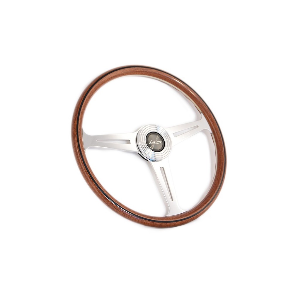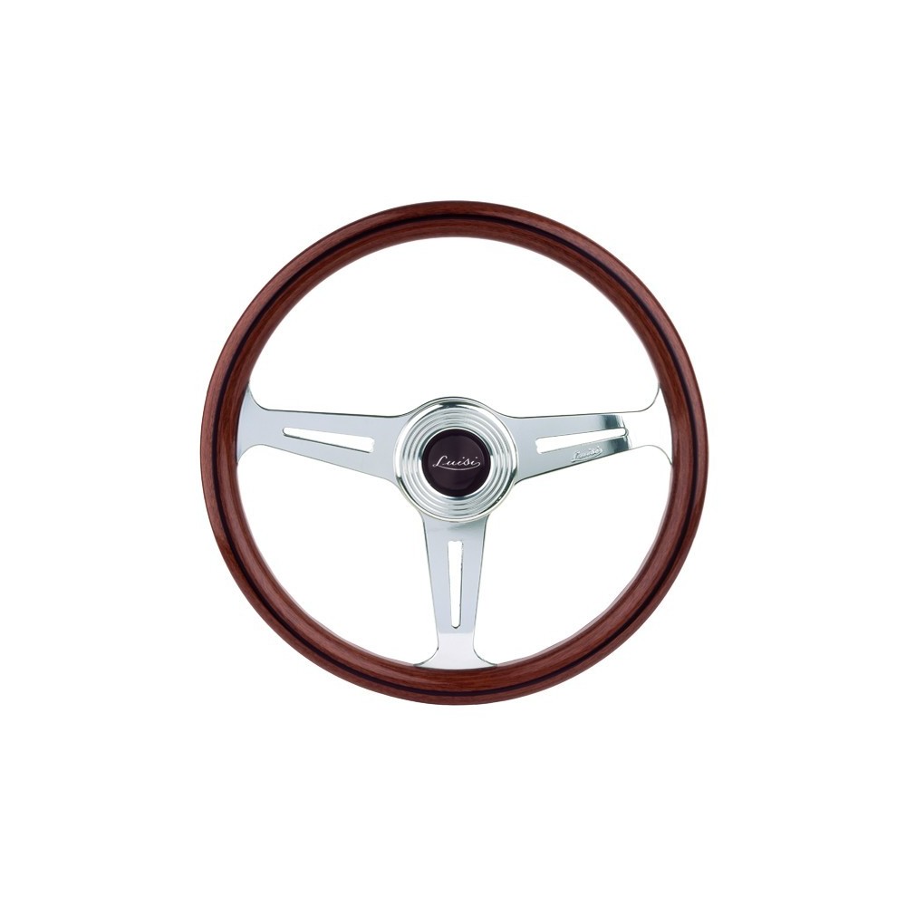 Marca: Luisi - Modello: Montecarlo - Diametro volante: 390mm / 15.4'' - Materiale: Mogano. Note: con razze lucidate e pulsante. ATTENZIONE: Si consiglia l'acquisto del relativo mozzo di marca Luisi specifico per auto.