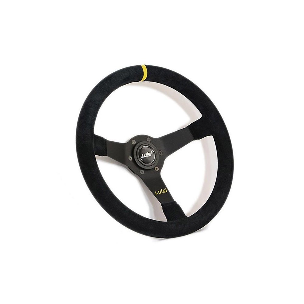 Marca: Luisi - Modello: Mirage Corsa - Diametro volante: 350mm / 13.8'' - Materiale: Camoscio. Altezza calice: 75mm. Note: con pulsante. ATTENZIONE: Si consiglia l'acquisto del relativo mozzo di marca Luisi specifico per auto.